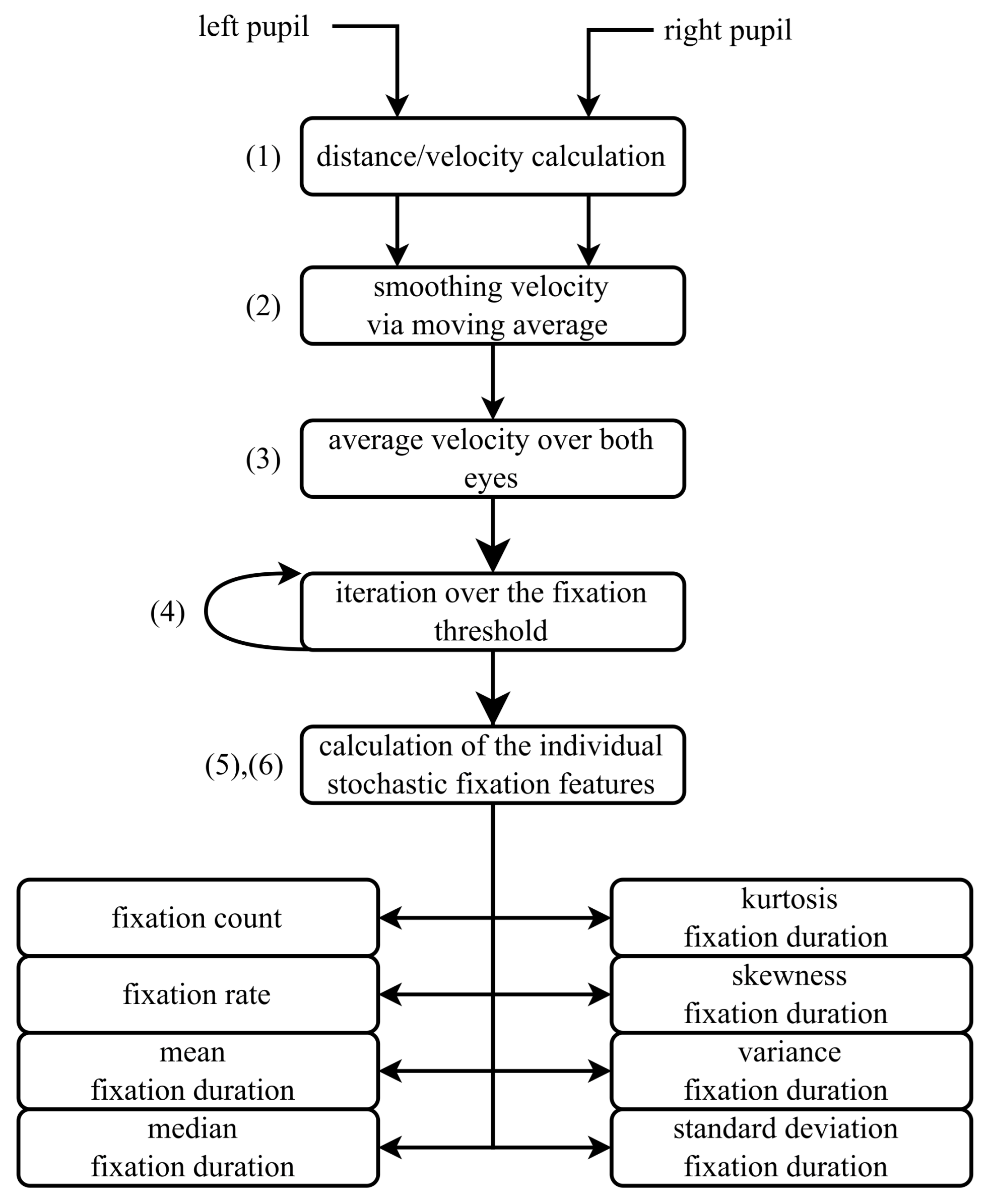- An iterative process is used to approximate the fixation threshold, which represents the maximum pupil movement speed at which a fixation state can still be assumed. Details of this approach and its limitations are provided in Section 4.4. The threshold is iteratively adjusted until it satisfies the specified requirements for the defined time interval.