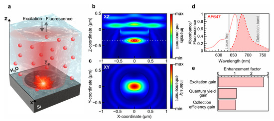 The principle of the Mie void sensor application is shown in Figure 1a. As molecules diffuse into the Mie void cavity, they experience enhanced excitation within the modal volume. The cavity’s geometry is optimized to support a single resonant mode, which serves to precisely define the effective detection volume. Notably, the confined mode is localized near the center of the cavity (Figure 1b,c), in contrast to plasmonic nanoantennas, where the hot spot is typically constrained to the metal surface. In such metallic structures, a substantial portion of energy is dissipated non-radiatively into the metal, which inherently limits the maximum achievable enhancement, particularly for emitters with high intrinsic quantum yield. Furthermore, the mode volume of the Mie void is sufficiently large to accommodate nano-objects several hundred nanometers in size, such as quantum dots, polymeric nanoparticles, or exosomes [39]. The simulated field distribution exhibits a characteristic electric dipole emission pattern. A significant fluorescence enhancement is anticipated for emitters within the Mie void when compared to both a standard glass substrate and a silicon reflecting surface. The fluorescence enhancement () in the presence of the Mie void resonator is expected to be represented as follows [51]: