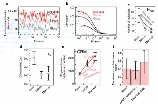 The photon time-tagged data were recorded by the time-tagging electronics module connected to a single-photon avalanche diode. The fluorescence time traces of AF647 diffusing though the Mie void demonstrate higher average intensity as compared to the case of focusing onto the bare silicon interface (Figure 3a). Moreover, a silicon interface seems to enable higher fluorescence intensity as compared to a conventional glass slide case, because of the collection efficiency gain in fluorescence back-reflection by silicon (reflectance of ballistic photons of ~62% within the detection band). We computed the autocorrelation function from the photon time-tagged data to monitor the diffusion of AF647 molecules through the detection volume as follows: