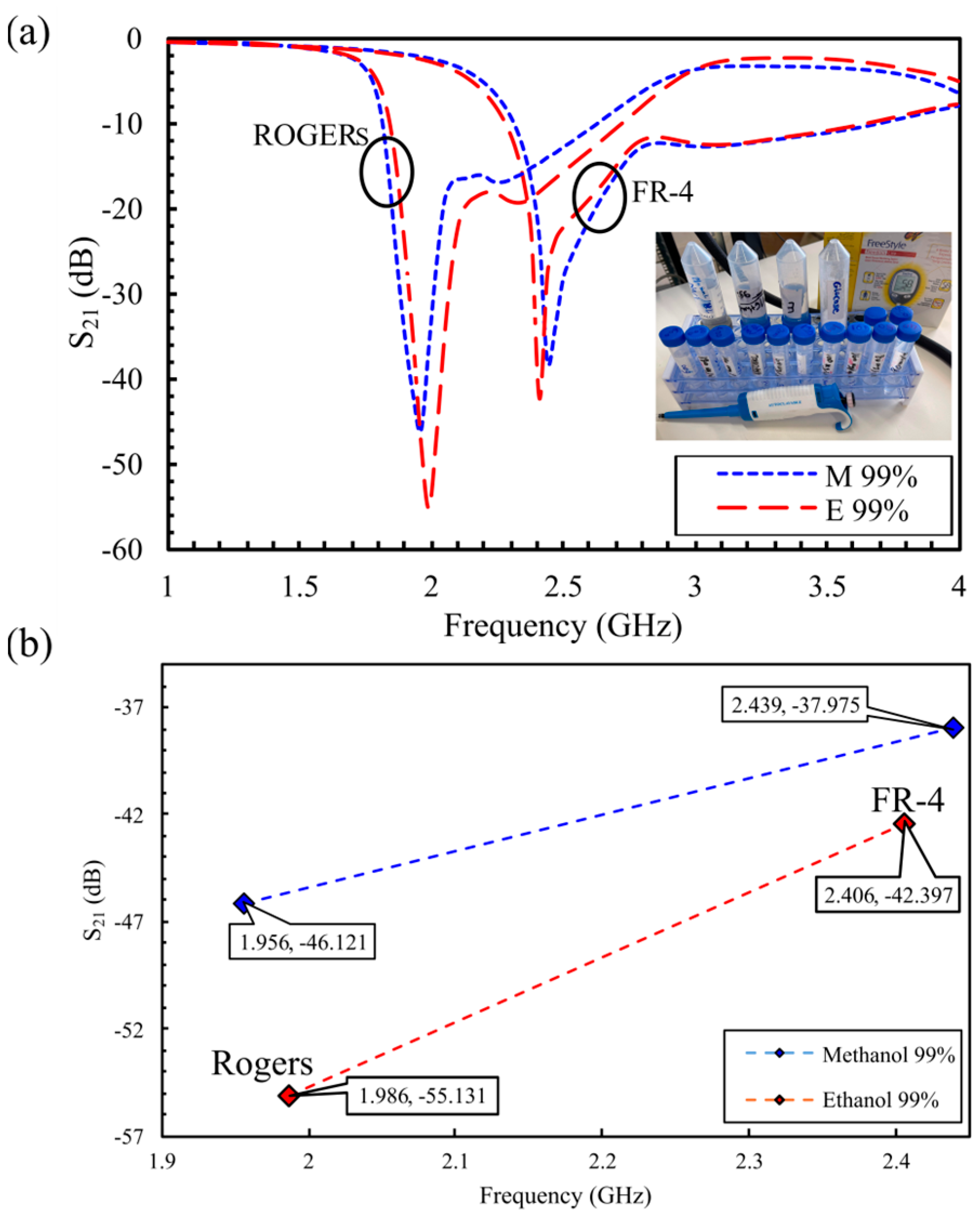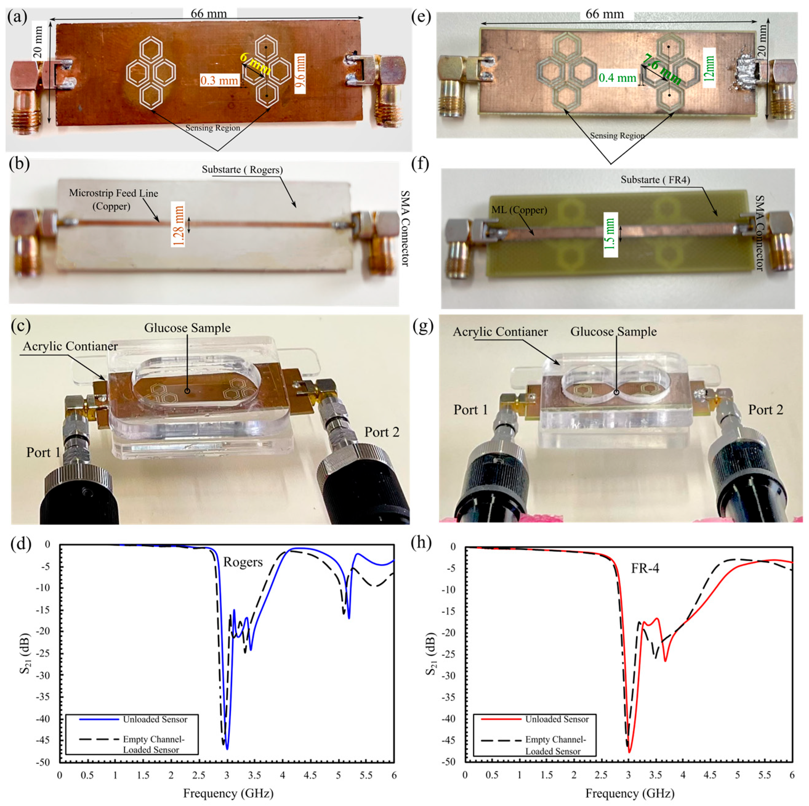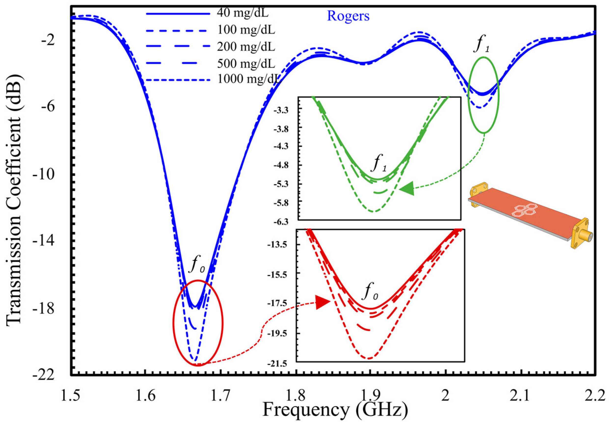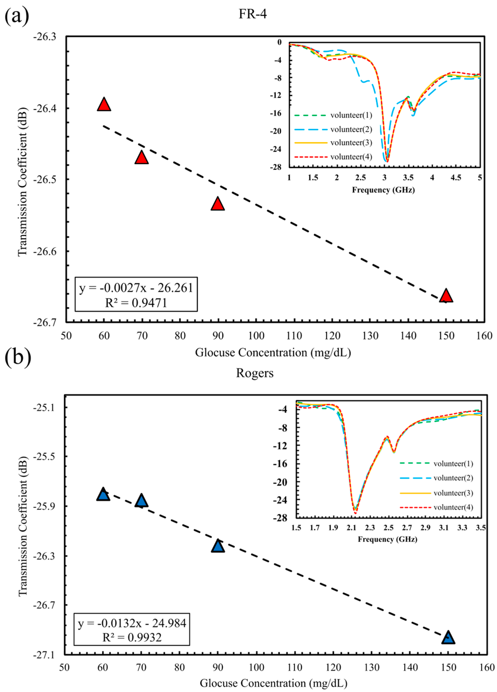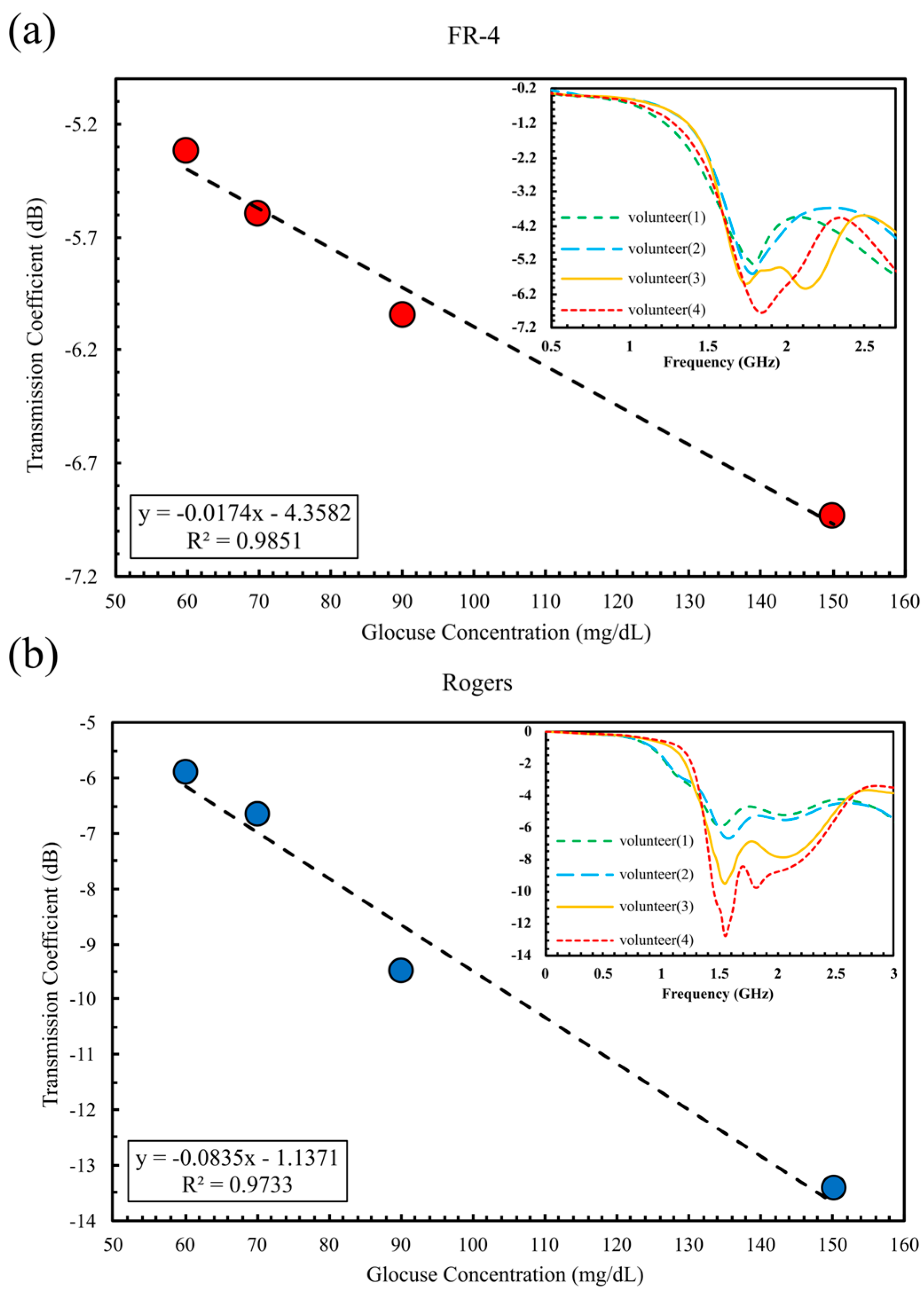 | Configuration | Substrate | ∣S21∣ (dB) | Sensitivity dB/(mg/dL) | R2 |