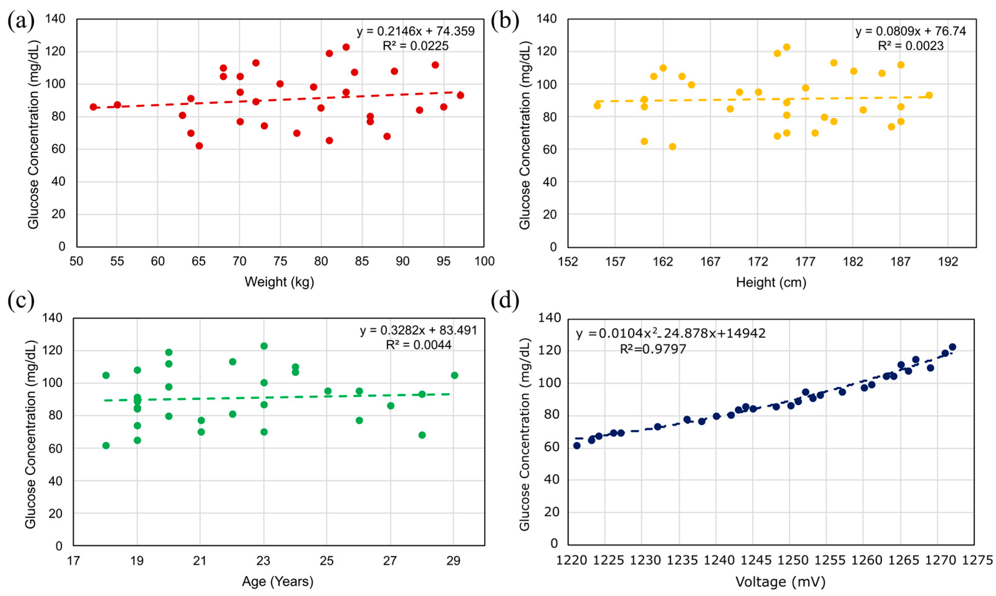 | Coefficients of the quadratic voltage–to–glucose calibration | |