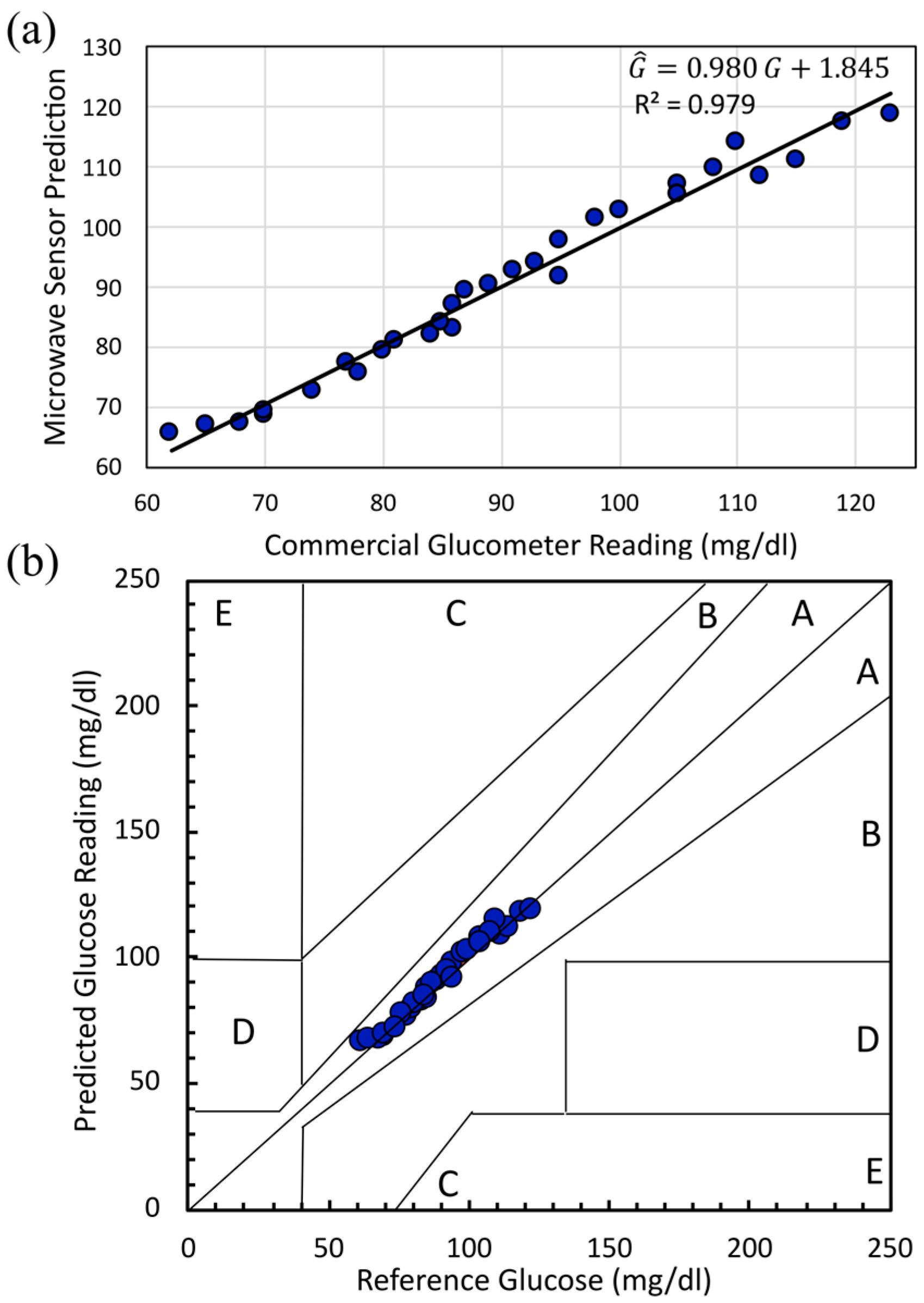 | Proposed dual-finger DHC-CSRR sensor (this work) | 97.83%; 100% within ±15 mg/dL (ISO 15197) and in Clarke zone A (60–125 mg/dL) | Non-invasive amplitude-based readout; local sensitivity ≈1.099 mg/dL/mV and ≈0.0935 dB/(mg/dL) | Fully non-invasive dual-finger contact on a planar microwave structure; no skin penetration | Research prototype; planar RF hardware with no per-sensor consumables, only periodic calibration |