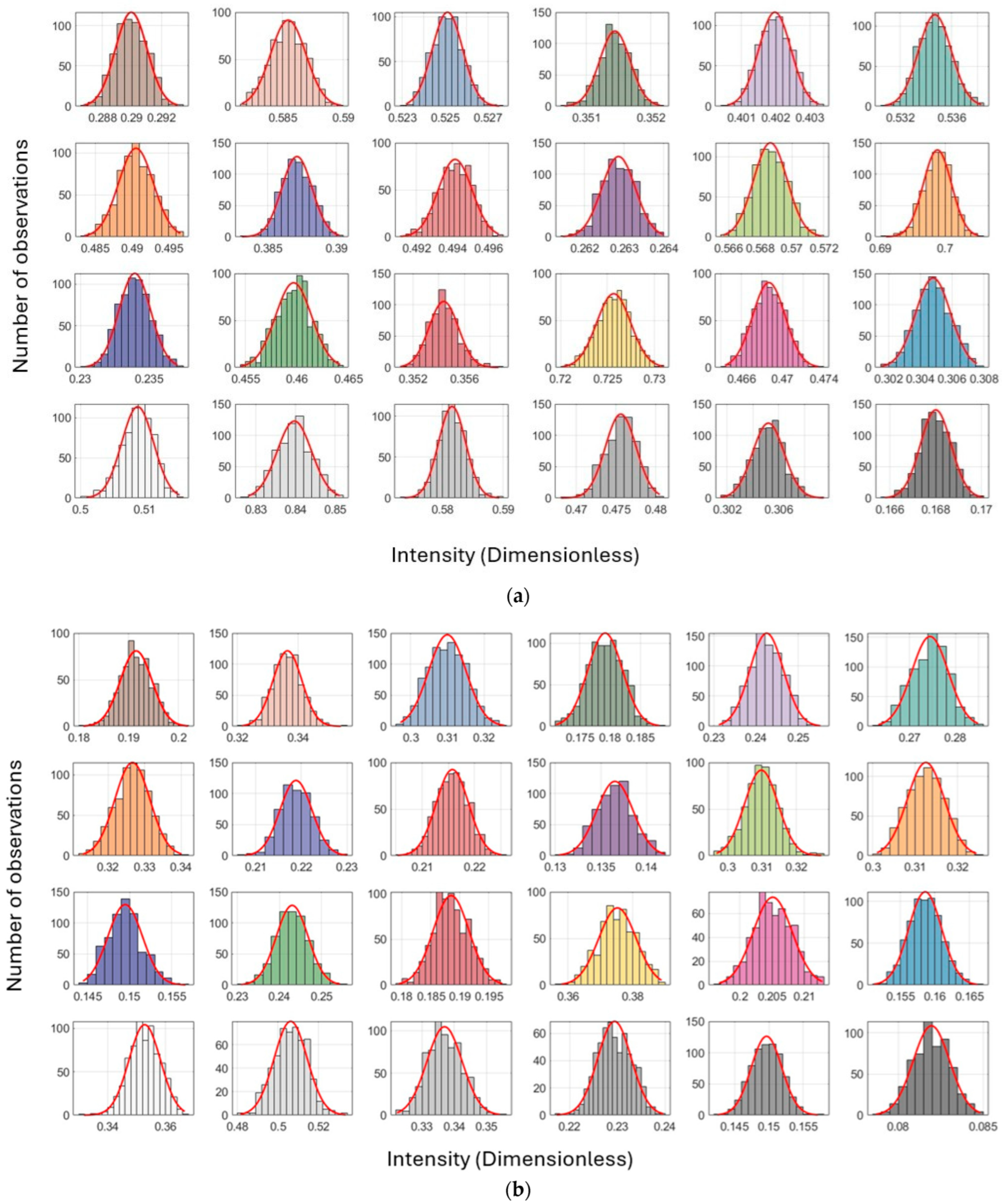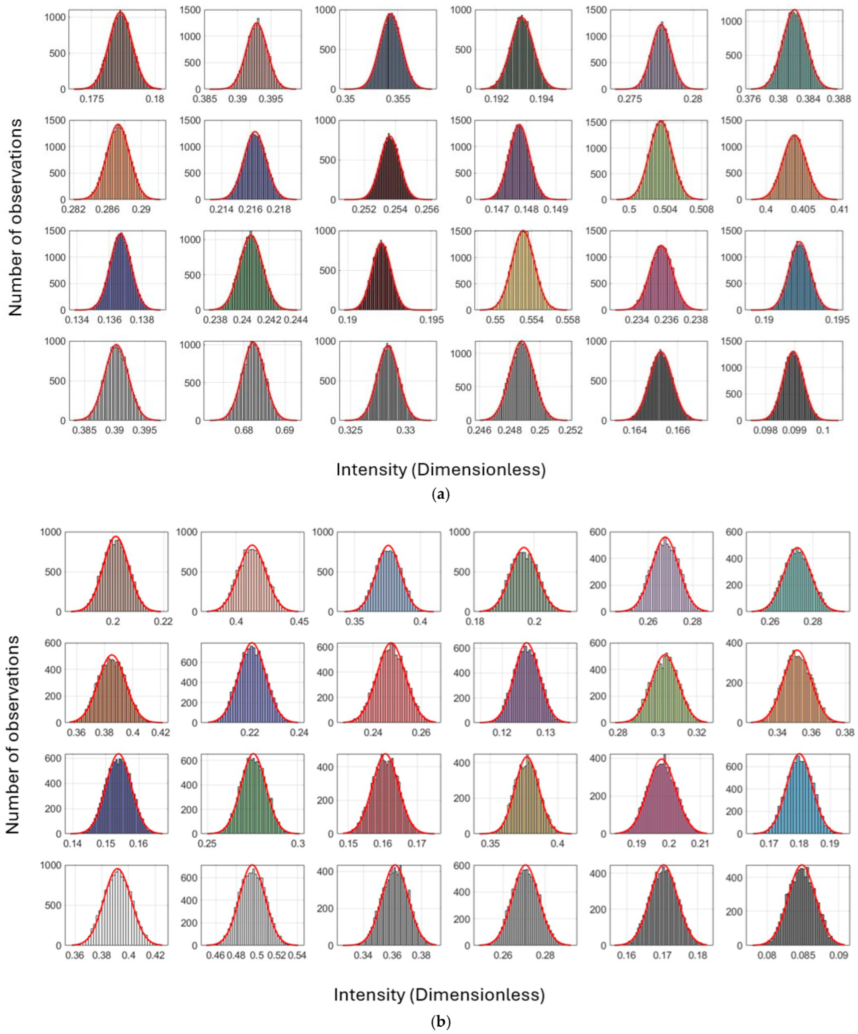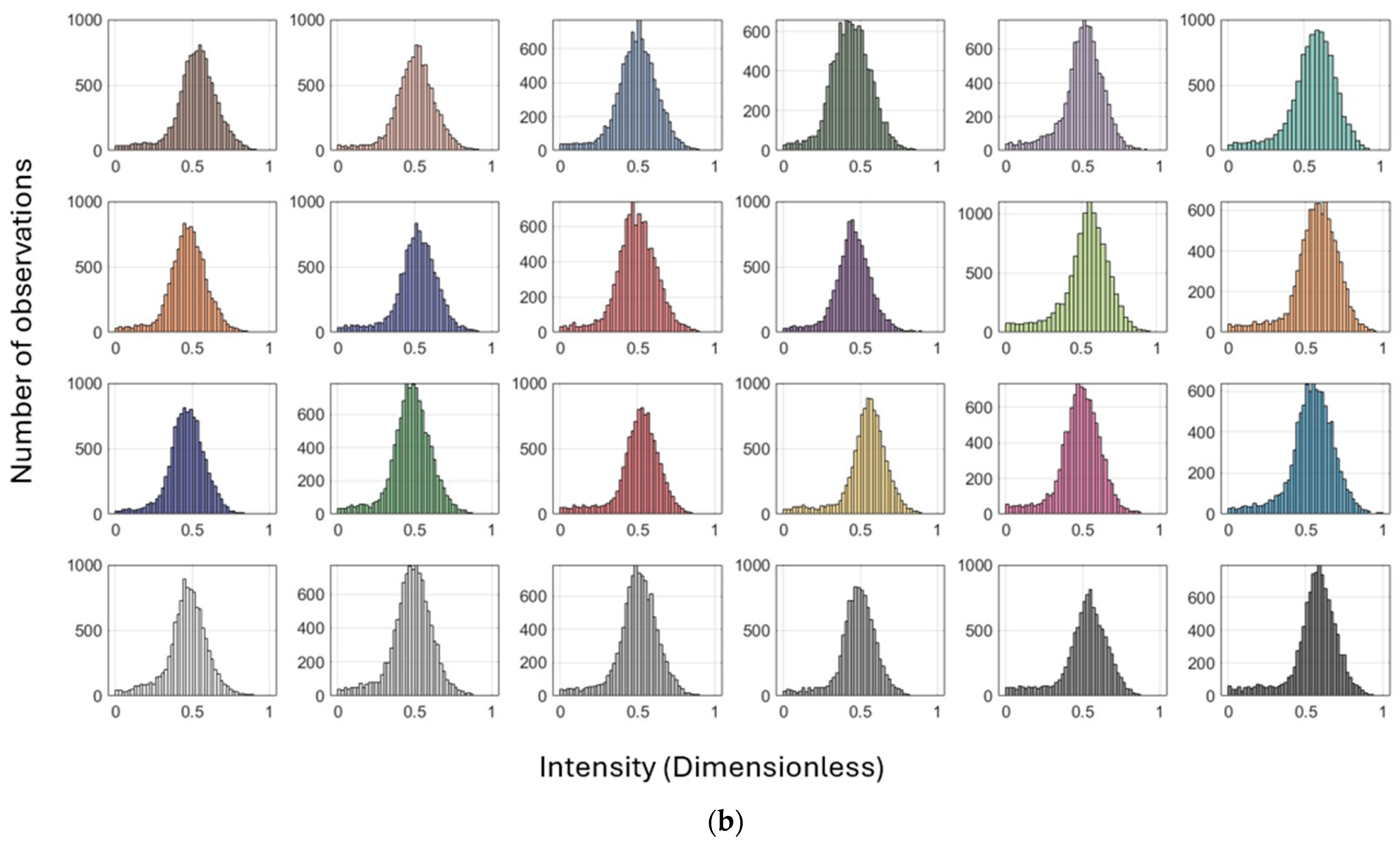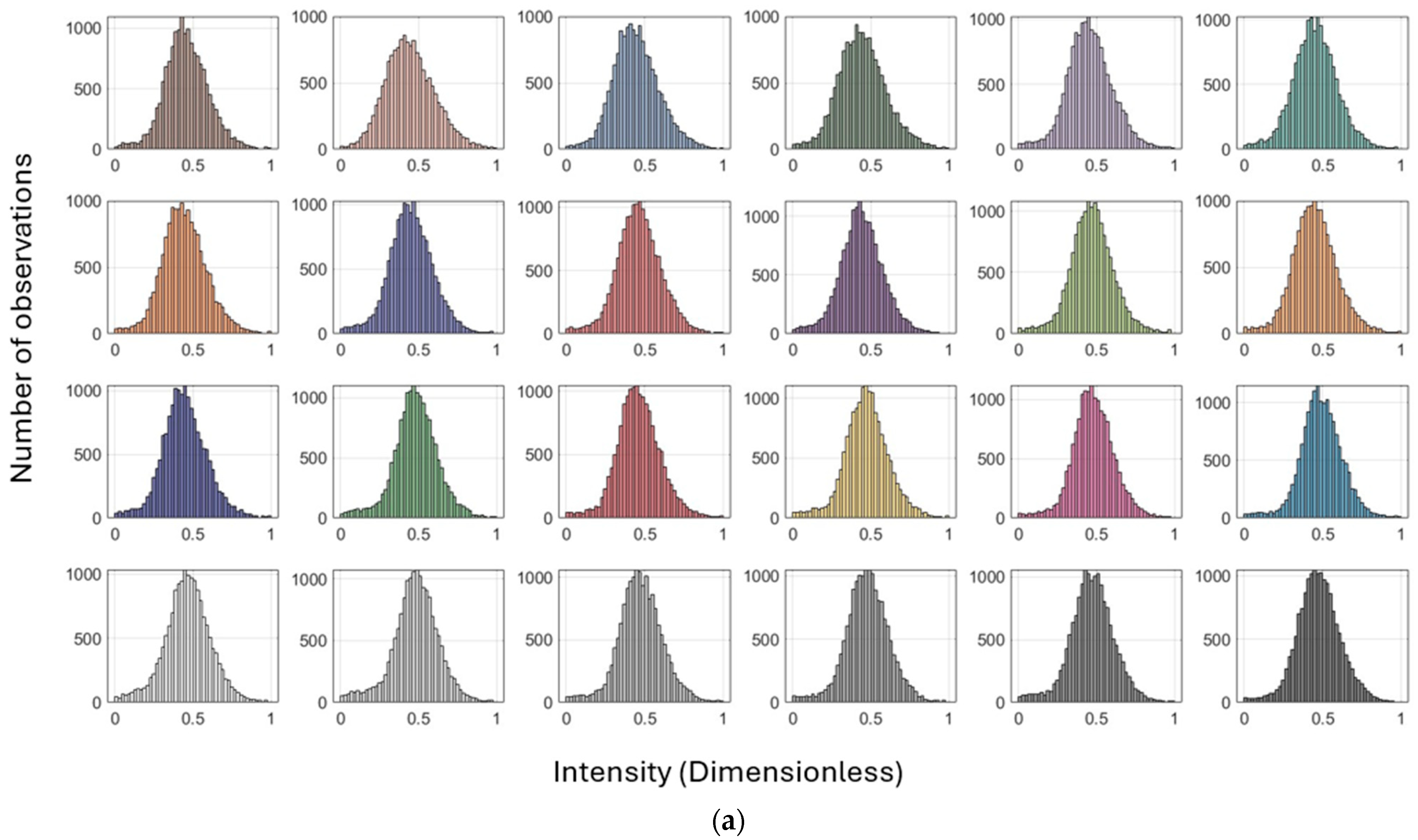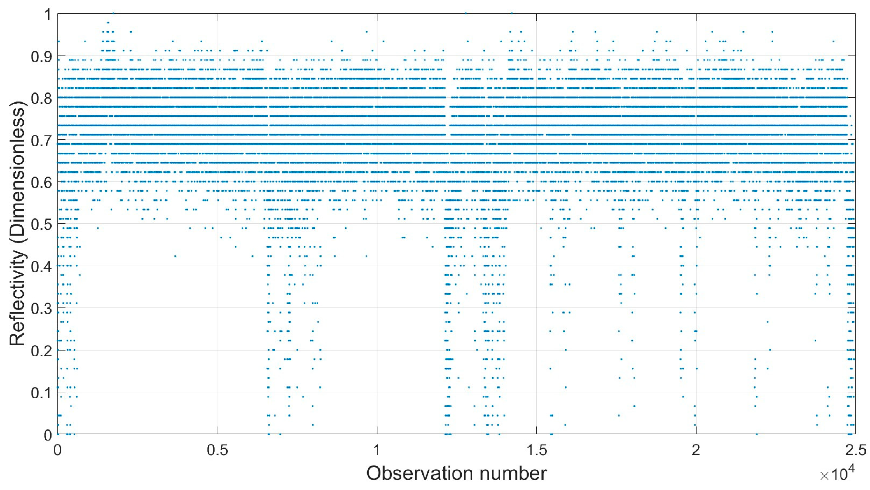 - The parameters, such as range, incidence angle, and color-dependent reflectivity obtained from the LiDAR range equation, are integrated into a feature matrix, and the output variable is determined as the intensity values.