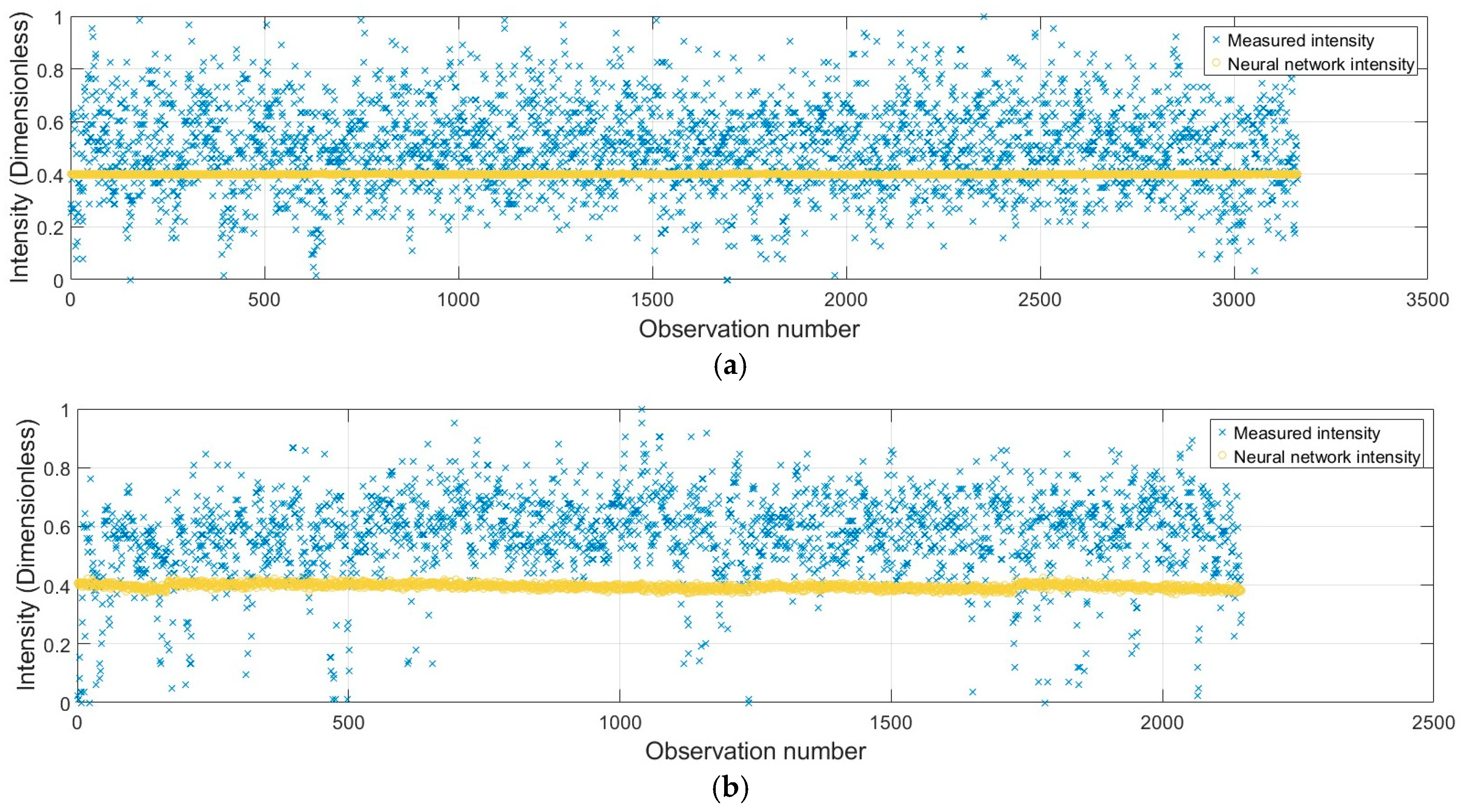 - A feed-forward neural network with two hidden layers (each containing 10 neurons) is trained using the Levenberg–Marquardt (trainlm) optimization algorithm. The hidden layers use the hyperbolic tangent sigmoid (tansig) activation function, while the output layer employs a linear (purelin) function suitable for regression. As an example, training is performed with a learning rate of , a maximum of epochs, and an early stopping criterion based on validation error. Finally, the objective function minimizes the mean squared error between predicted intensity and color-dependent intensity using the LiDAR range equation (i.e., those were formerly validated through the intrinsic reflectance coefficient).