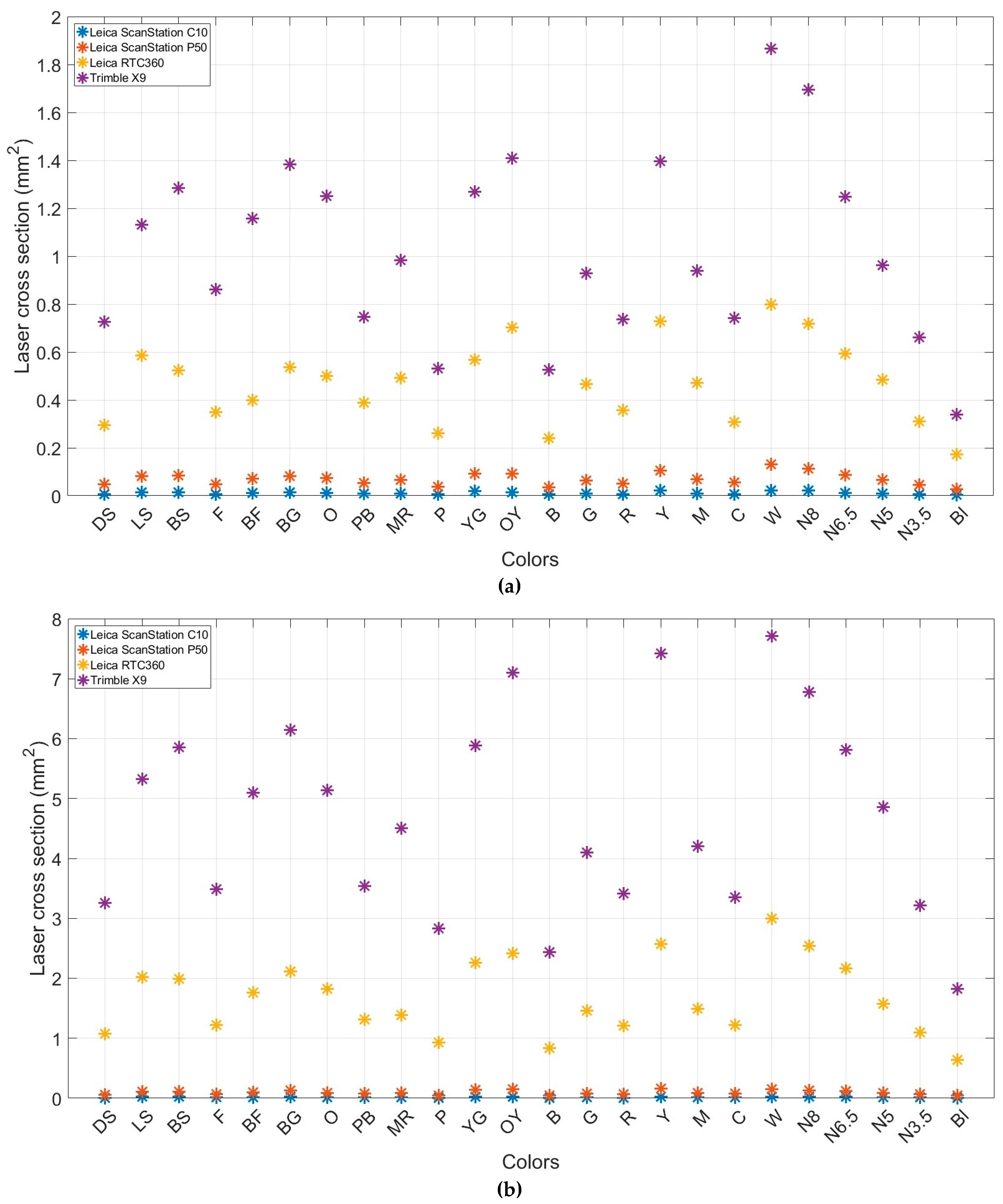 - Yaman, A.; Yilmaz, H.M. The effects of object surface colors on terrestrial laser scanners. Int. J. Eng. Geosci. 2017, 2, 68–74. [Google Scholar] [CrossRef]