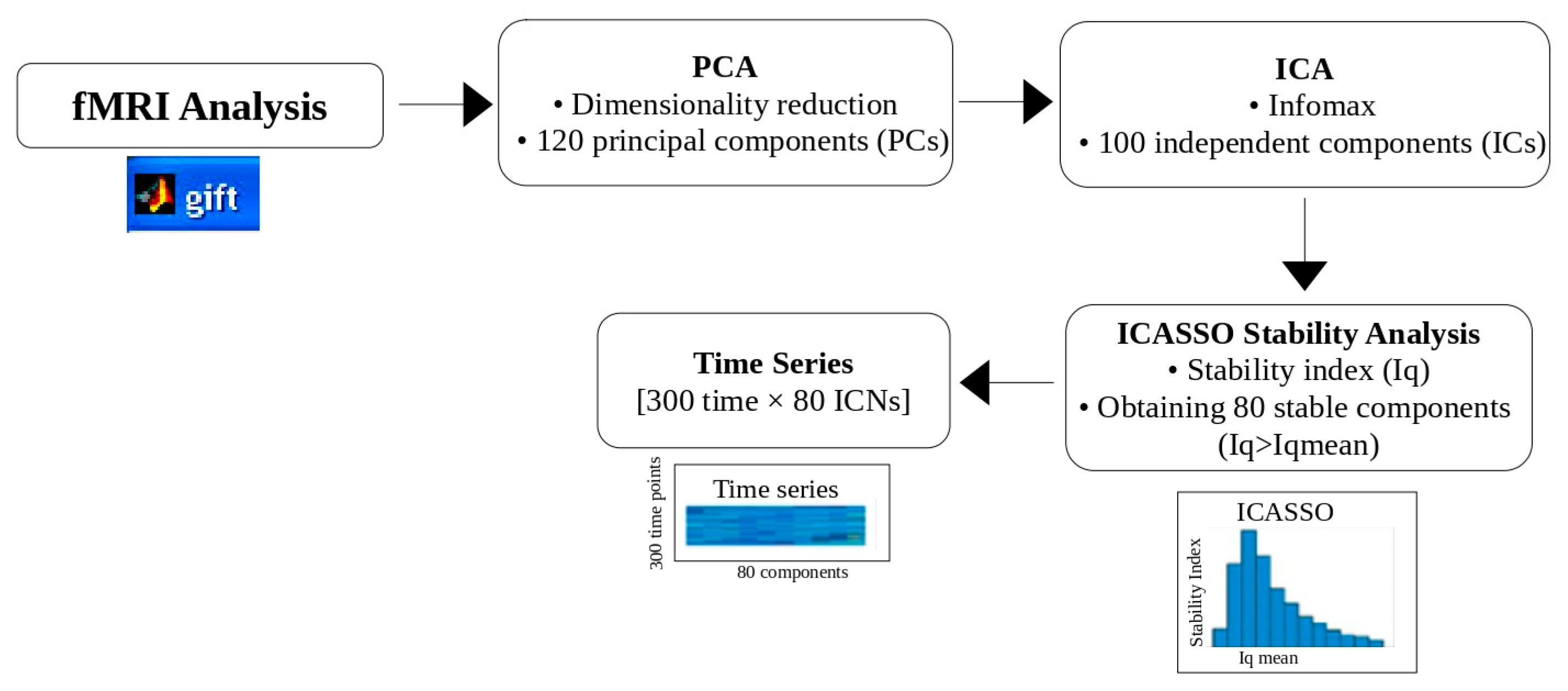 - Rachakonda, S.; Egolf, E.; Correa, N.; Calhoun, V. Group ICA of fMRI Toolbox (GIFT) Manual. Dostupnez Cit 2011-11-5 2007. Available online: https://www.nitrc.org/docman/view.php/55/295/v1_203d_GIFTManual.pdf (accessed on 25 October 2024).