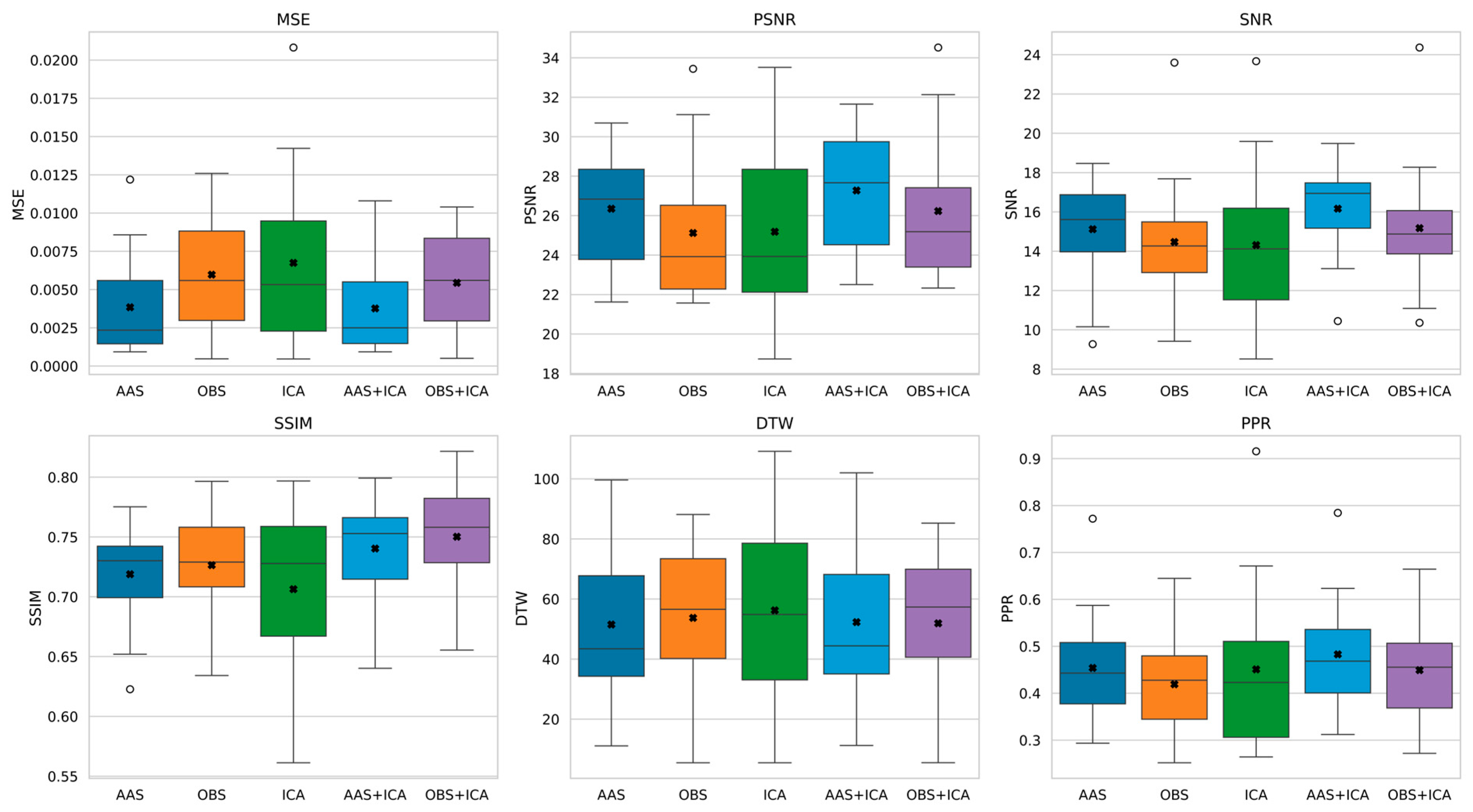 - On the other hand, the OBS + ICA method gave the highest result in terms of SSIM value and best preserved the structural integrity of the signal.