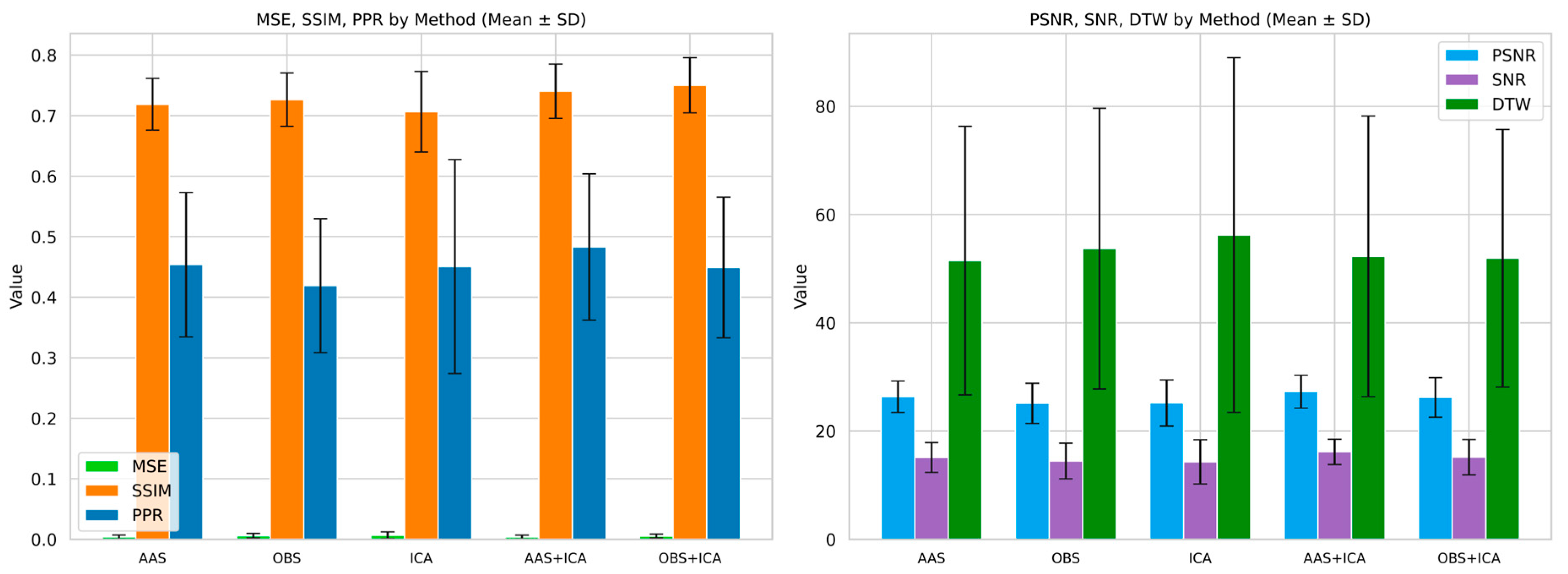 - The AAS + ICA combination performed best in terms of MSE, PSNR, SNR, and PPR metrics, making it the most effective method in terms of both artifact removal success and signal quality.