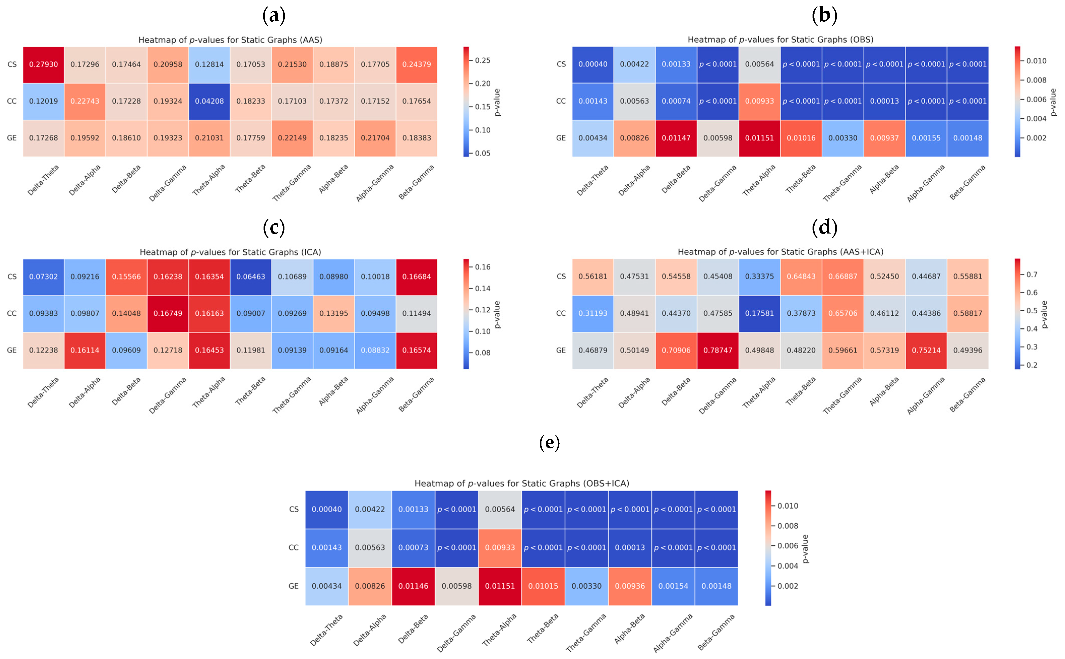 3.2. Statistical Evaluation: Graph Metric Comparisons Across Frequency Bands