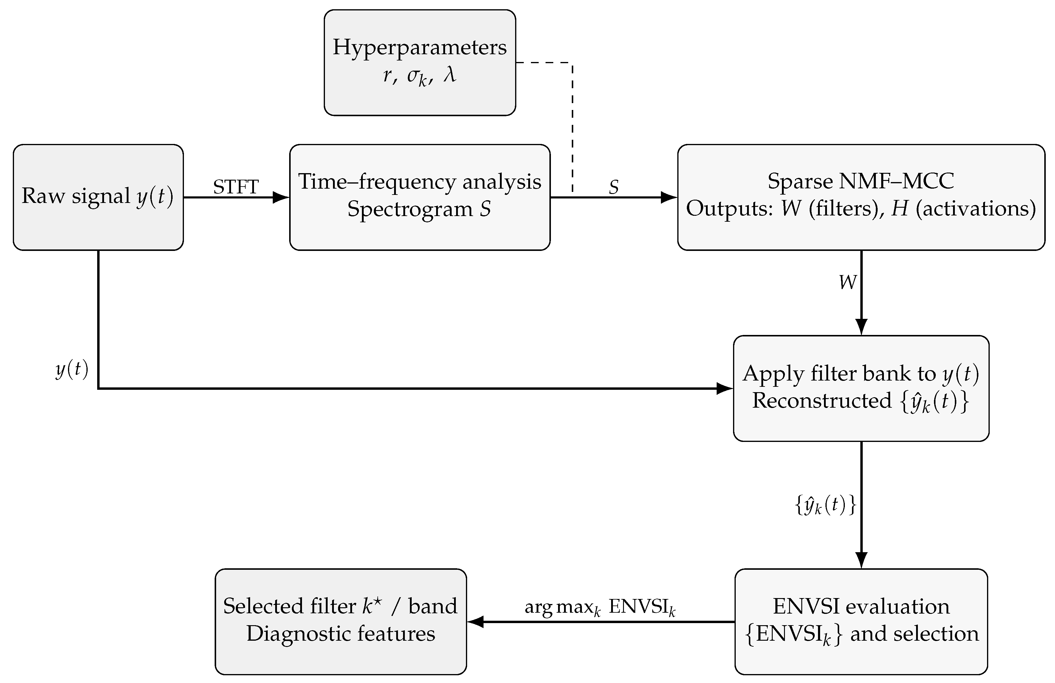 - Automatic filter selection: The Envelope Spectrum Indicator (ENVSI) is employed to automatically identify the most informative NMF component corresponding to the fault-related frequency band, ensuring objective and repeatable filter selection.