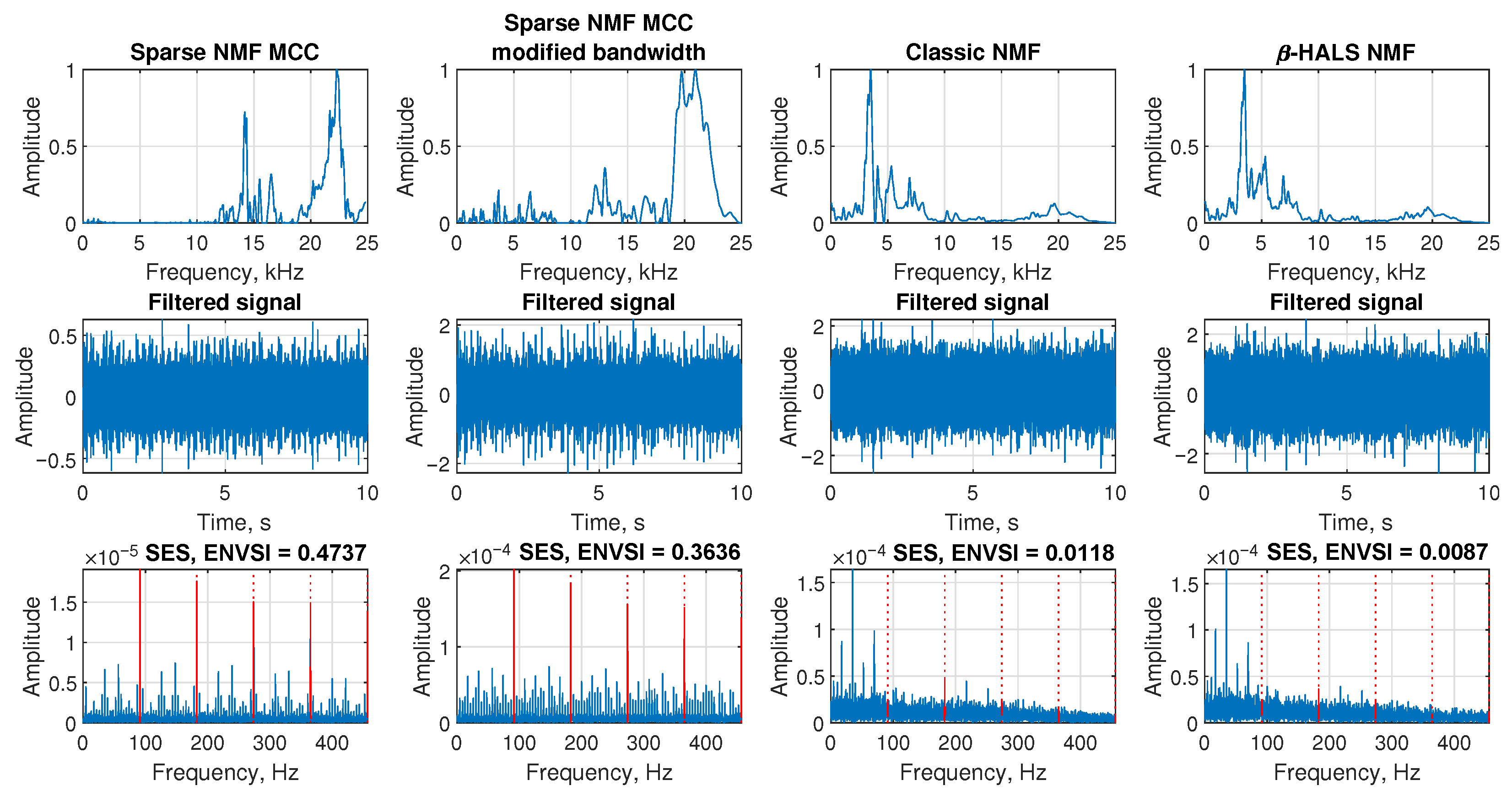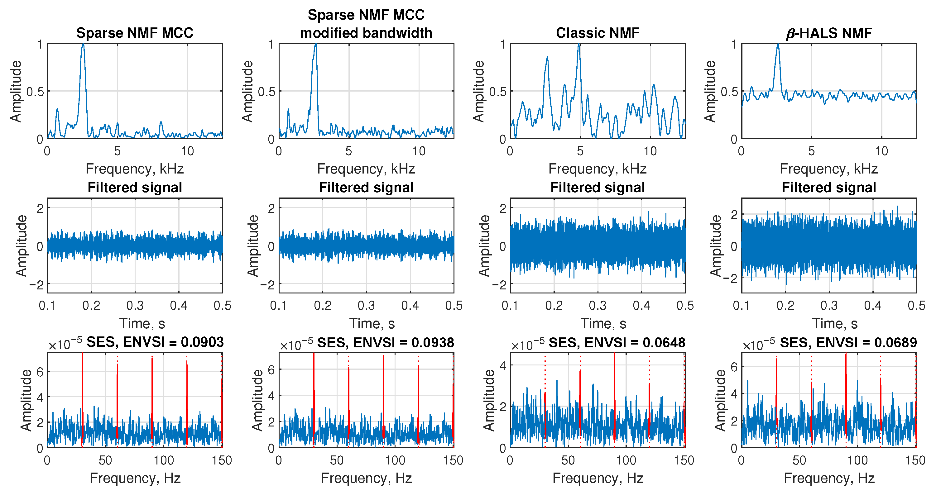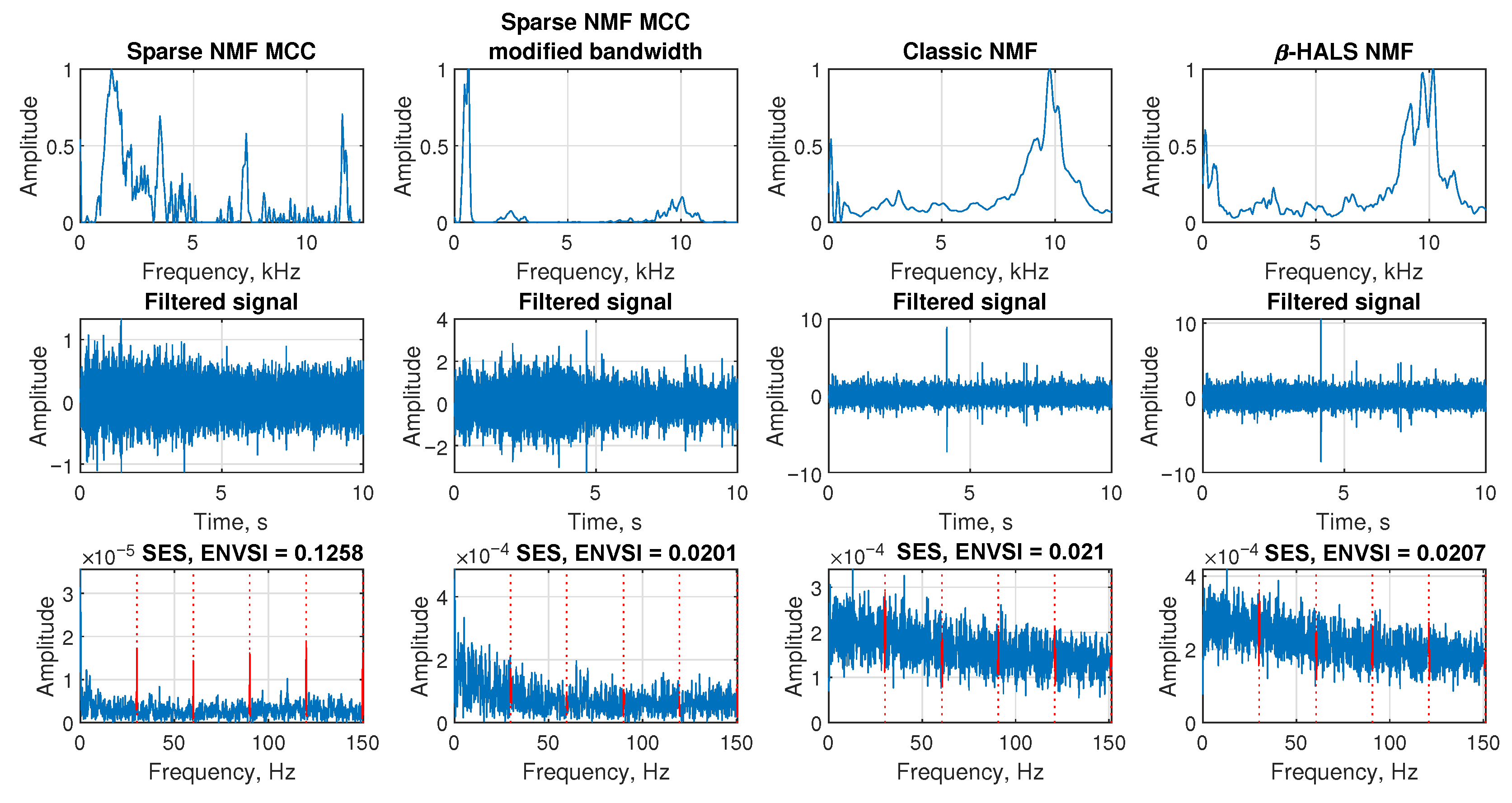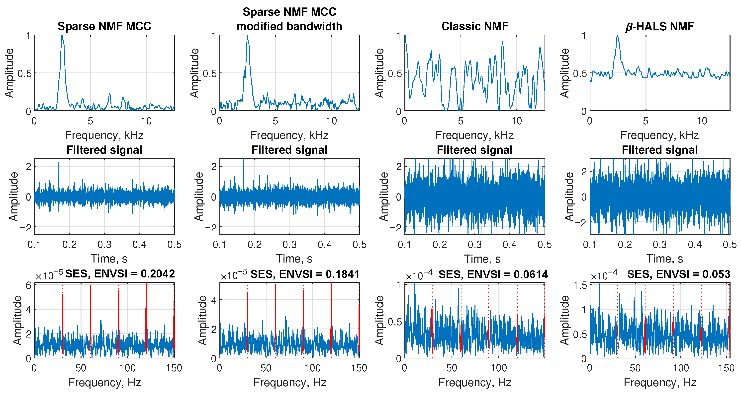- Comparative validation: The proposed Sparse NMF-MCC is benchmarked against the classic NMF and -HALS NMF algorithms, demonstrating that the MCC-based approach consistently achieves higher ENVSI values and clearer fault-frequency localization across both simulated and real-world datasets (belt conveyor, ore crusher, and test rig).
