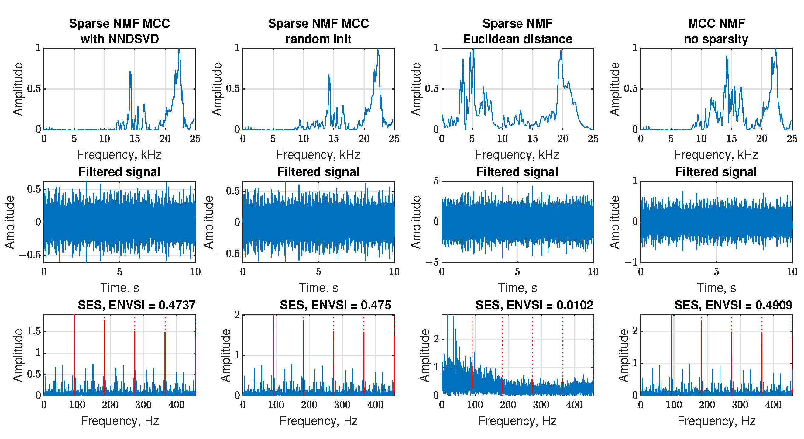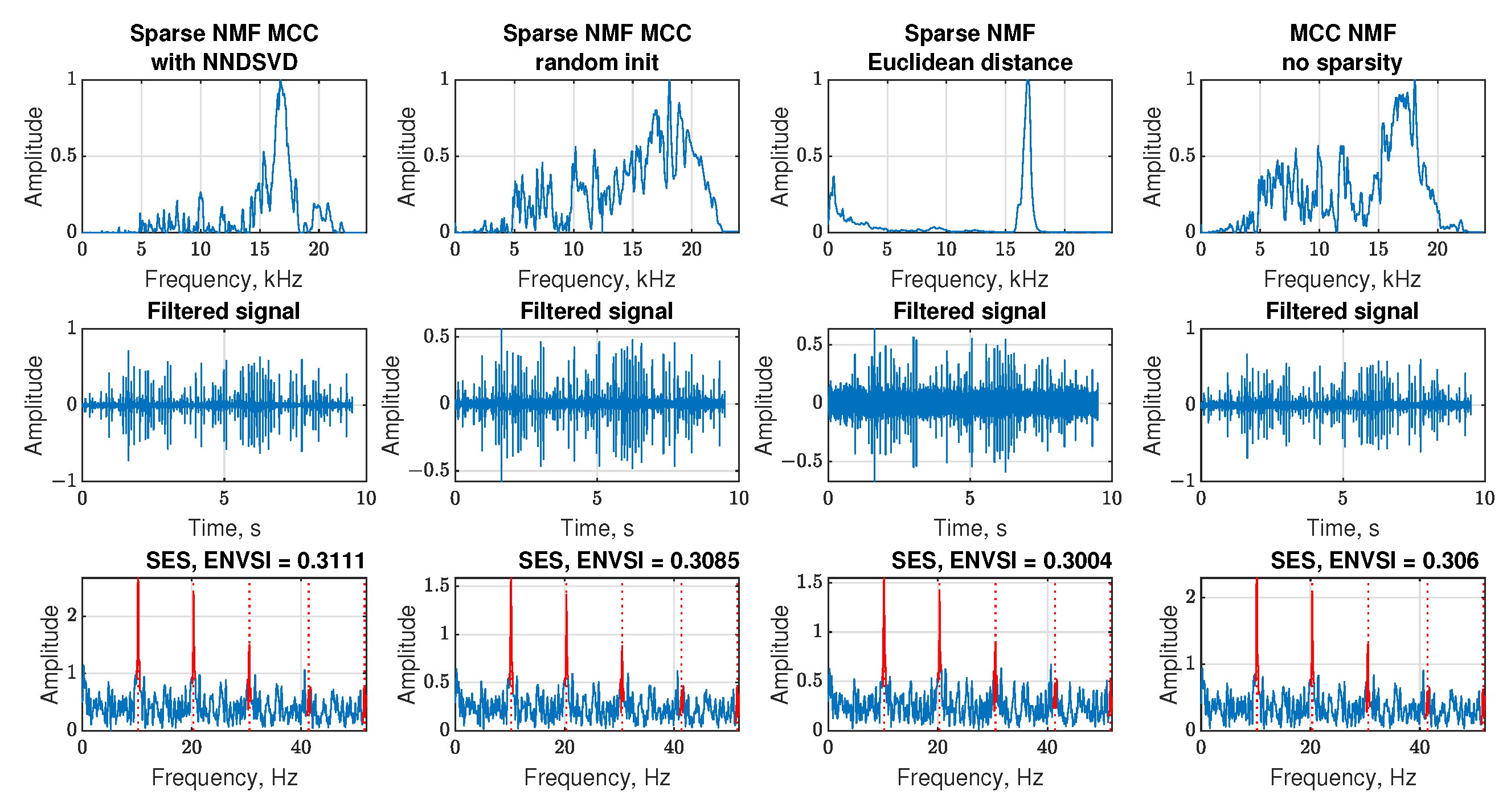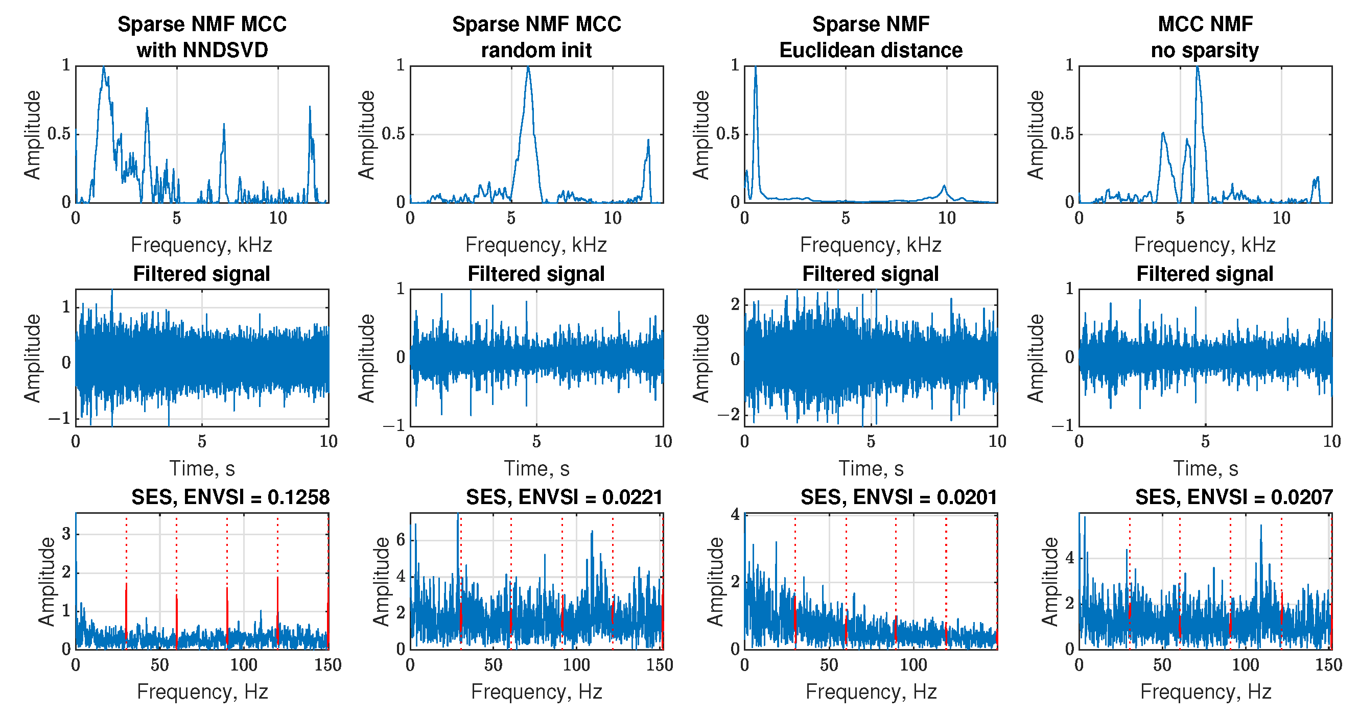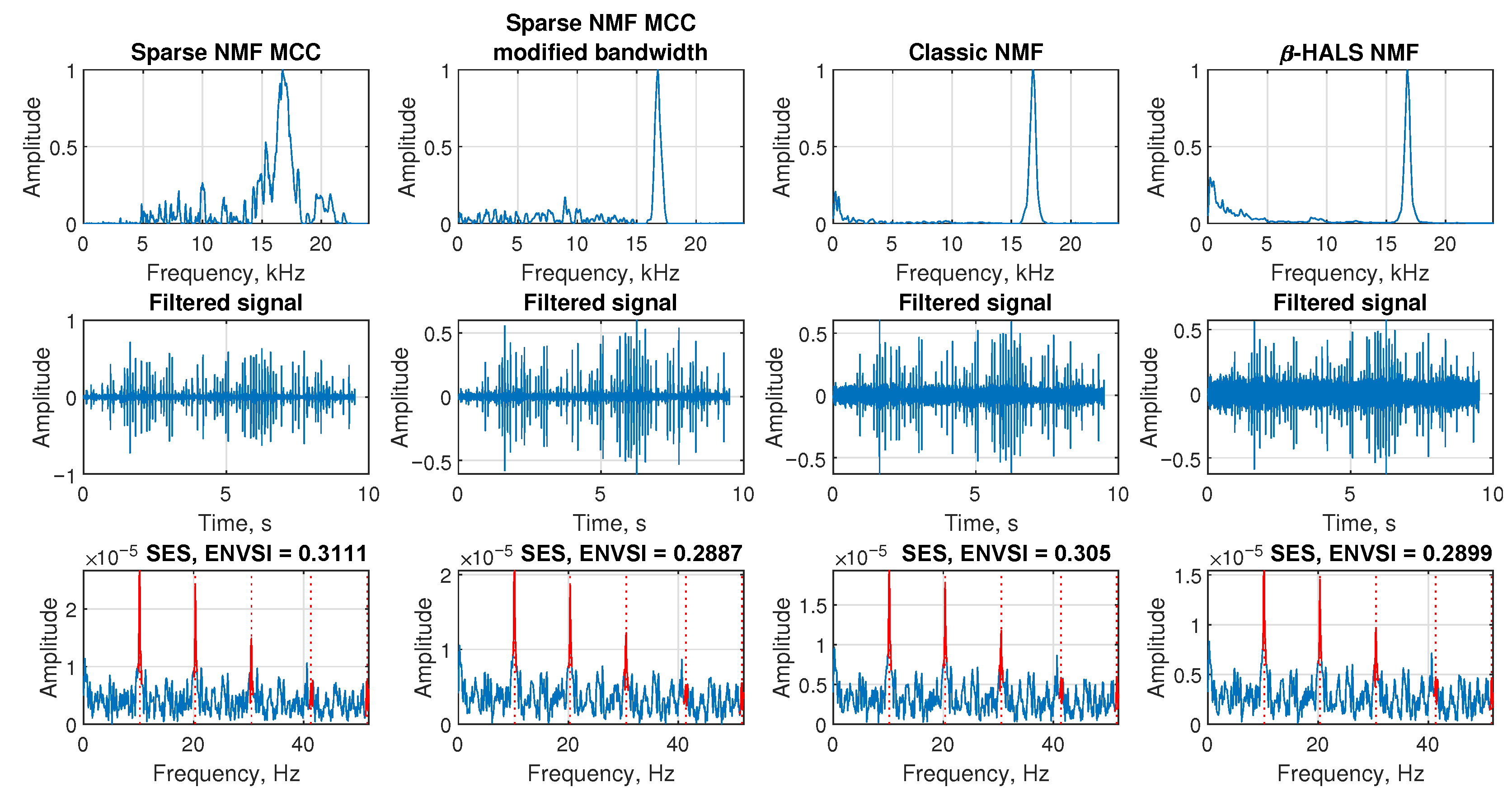 - Comparative validation: The proposed Sparse NMF-MCC is benchmarked against the classic NMF and -HALS NMF algorithms, demonstrating that the MCC-based approach consistently achieves higher ENVSI values and clearer fault-frequency localization across both simulated and real-world datasets (belt conveyor, ore crusher, and test rig).
