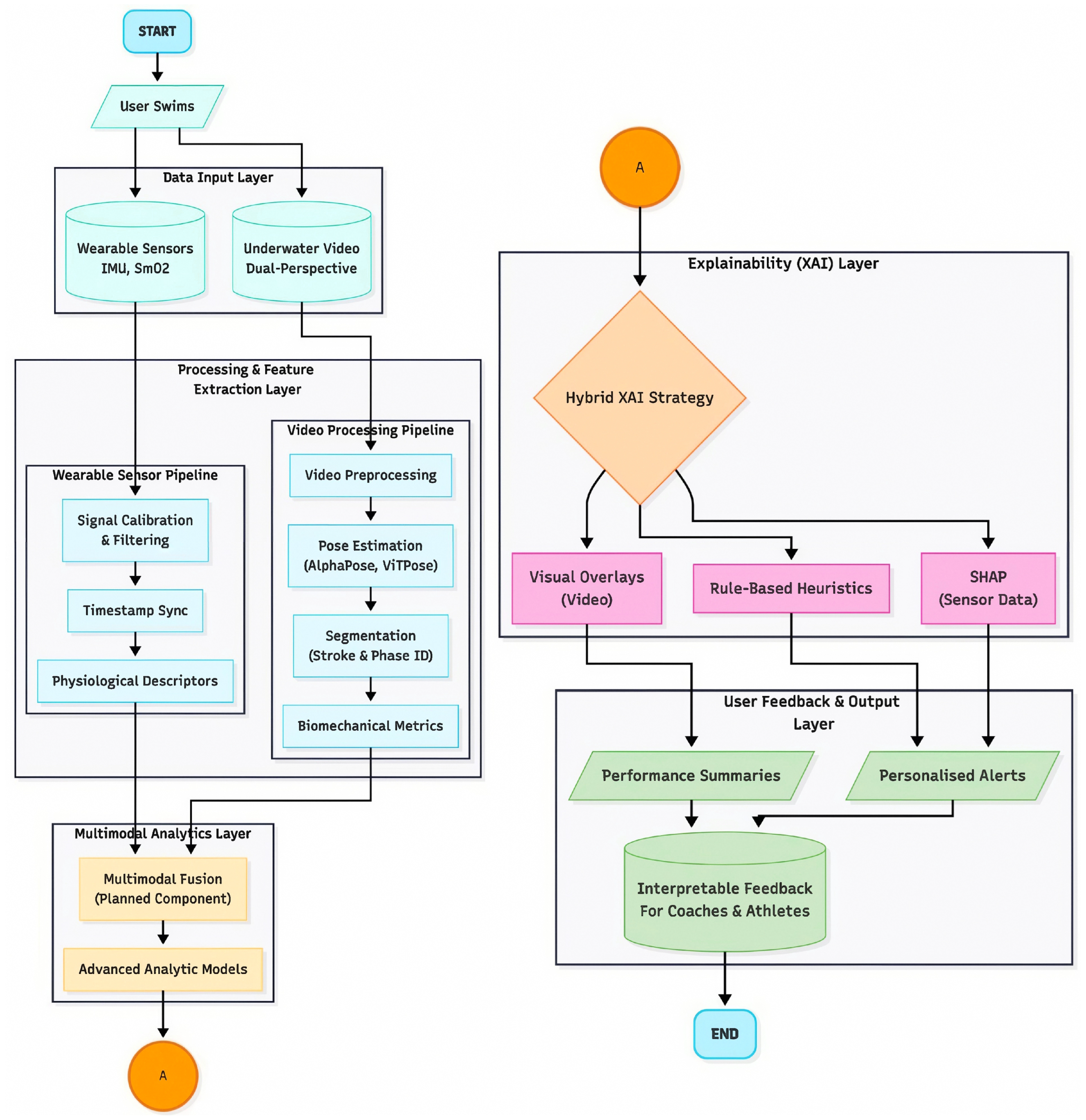 Figure 1 illustrates the conceptual architecture of the SWIM-360 system, which integrates multimodal sensing, explainability mechanisms, and user-centred feedback. The process begins with data capture from wearable inertial and near-infrared spectroscopy (NIRS) sensors together with dual-perspective underwater video. These data streams pass through calibration, synchronisation, and feature-extraction pipelines before being combined within a planned multimodal analytics layer. A dedicated explainability layer implements a hybrid XAI strategy that merges SHAP-based feature attribution for sensor data with visual overlays and rule-based heuristics for video insights. The resulting feedback is aggregated into a coach-facing interface that provides interpretable performance summaries and personalised alerts.