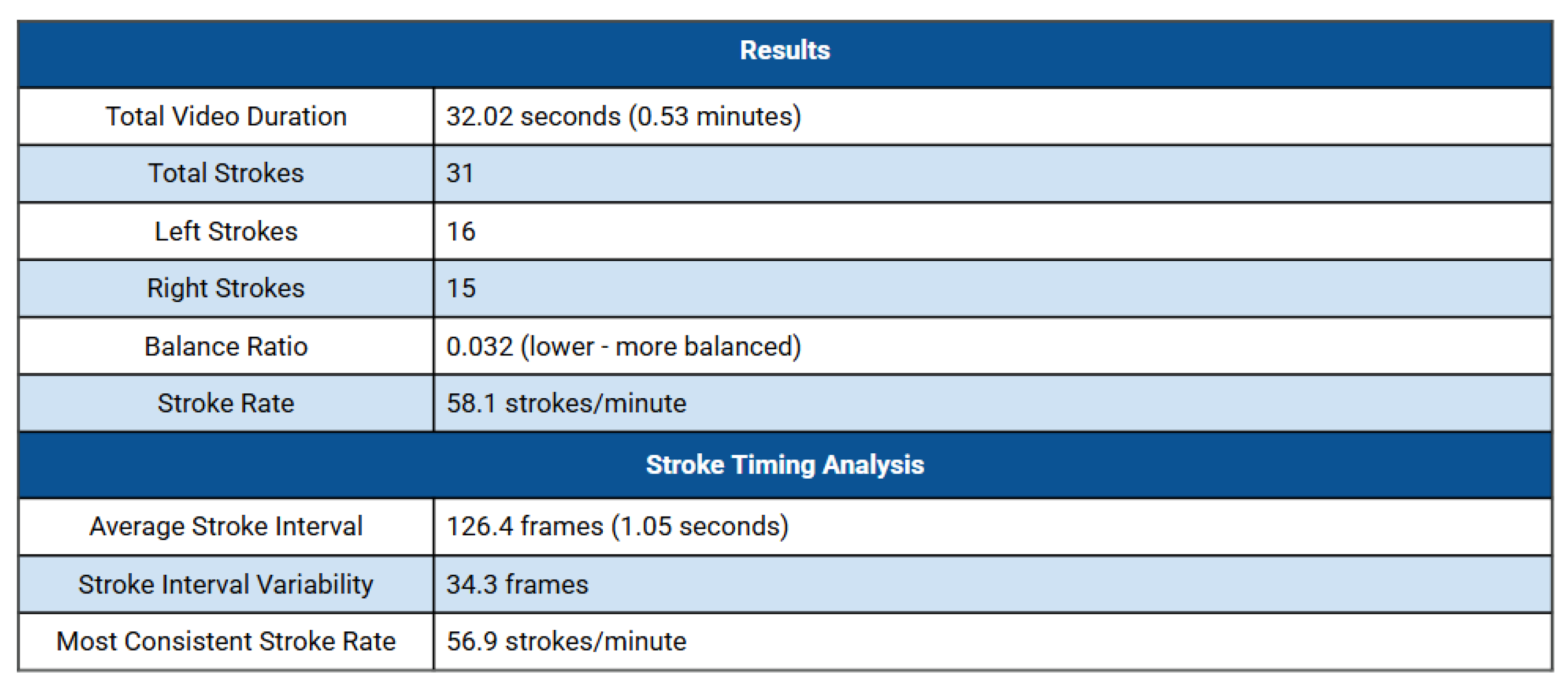 Figure 2, and key temporal events. These outputs support lap-to-lap comparisons of timing characteristics and stroke counts, providing a consistent basis for analysing stroke patterns as well as their temporal evolution. Although the video-processing module is still being tuned, the current results indicate that the overall approach is technically feasible and promising for future large-scale deployment.