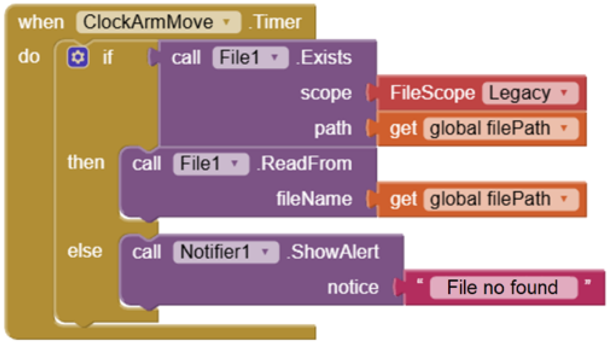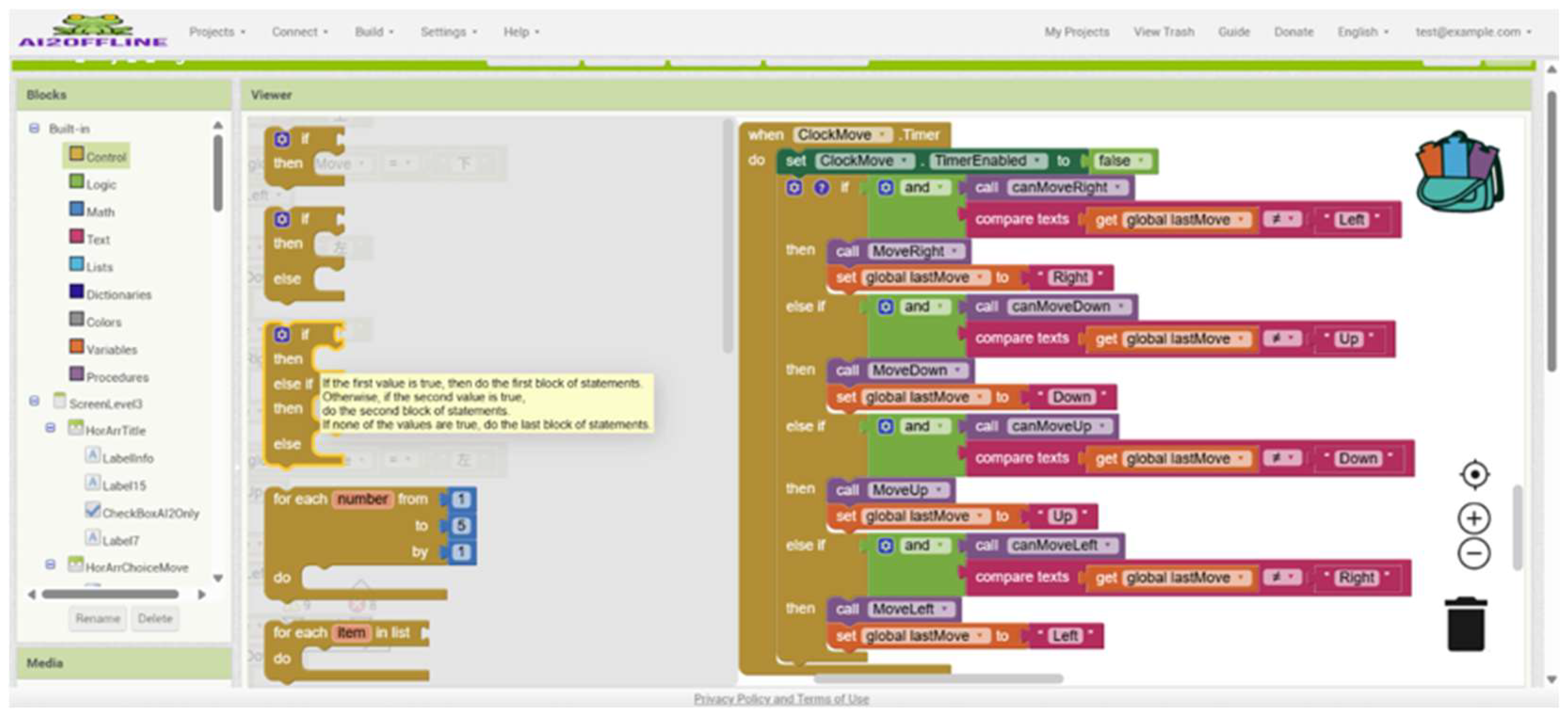 App Inventor 2, developed by Google and now maintained by MIT, is a block-based visual programming platform [9] that lowers entry barriers for novices by allowing drag-and-drop coding for Android apps (Figure 2). Unlike Scratch, it emphasizes mobile app development and sensor/IoT integration, enabling students to connect abstract computational concepts with real-world tasks [10]. While prior studies have reported that App Inventor 2 can improve computational thinking and problem-solving skills [11,12,13,14,15,16], findings are often descriptive and context-specific, focusing on task completion rather than measuring cognitive strategies, algorithmic reasoning, or logical structure application.