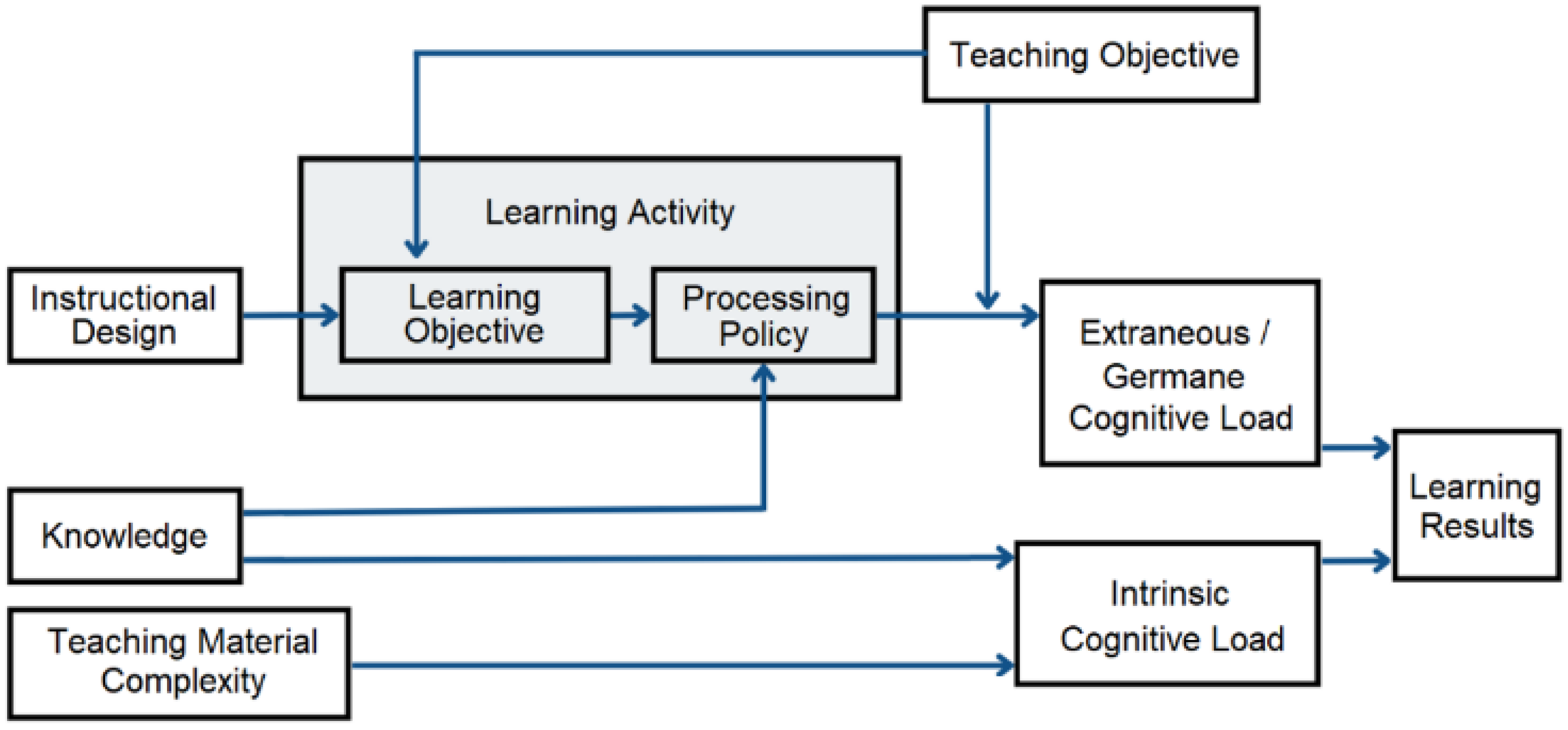Cognitive Load Theory (CLT) emphasizes the limits of working memory and the need to balance intrinsic, extraneous, and germane load for effective learning [41]. Poor instructional design or abstract learning materials increase extraneous load, hindering CT and programming acquisition. According to Sweller [42], cognitive load consists of three types (Figure 3): intrinsic load, which arises from the complexity of materials and the learner’s prior knowledge; extraneous load, caused by ineffective instructional design or presentation that diverts cognitive resources; and germane load, referring to the mental effort invested in understanding and constructing knowledge. To differentiate task difficulty from mental effort, Paas further distinguished between mental load and mental effort, providing a framework for assessing cognitive load [43].