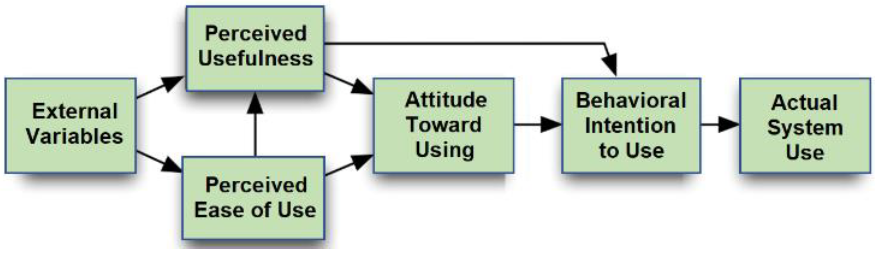 The Technology Acceptance Model (TAM) [44] was developed based on the Theory of Reasoned Action [45] and provides a framework for understanding users’ perceptions and behavioral intentions toward adopting new technologies. TAM posits that Perceived Usefulness (PU) and Perceived Ease of Use (PEOU) are the primary determinants of users’ attitudes and intentions, which in turn influence the actual system usage [46]. To enhance its explanatory and predictive power, TAM was extended to TAM II (Figure 4) by incorporating external variables [47].