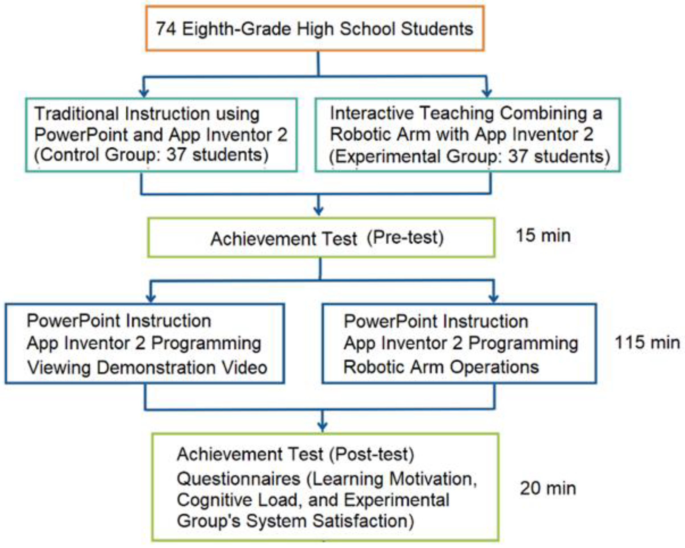 To evaluate the effectiveness of this module, a quasi-experimental design was employed. The experimental group engaged in interactive, hands-on learning using the robotic arm integrated with App Inventor 2, whereas the control group received equivalent instruction via App Inventor 2 supported by video demonstrations. Both groups completed achievement tests and surveys assessing learning performance, motivation, and cognitive load, with the experimental group additionally completing a system satisfaction survey. Furthermore, semi-structured interviews were conducted to capture the students’ learning experiences and feedback, providing a qualitative complement to the quantitative results. These interviews served to obtain richer insights into the students’ perceptions and engagement that might not be fully reflected in quantitative data.