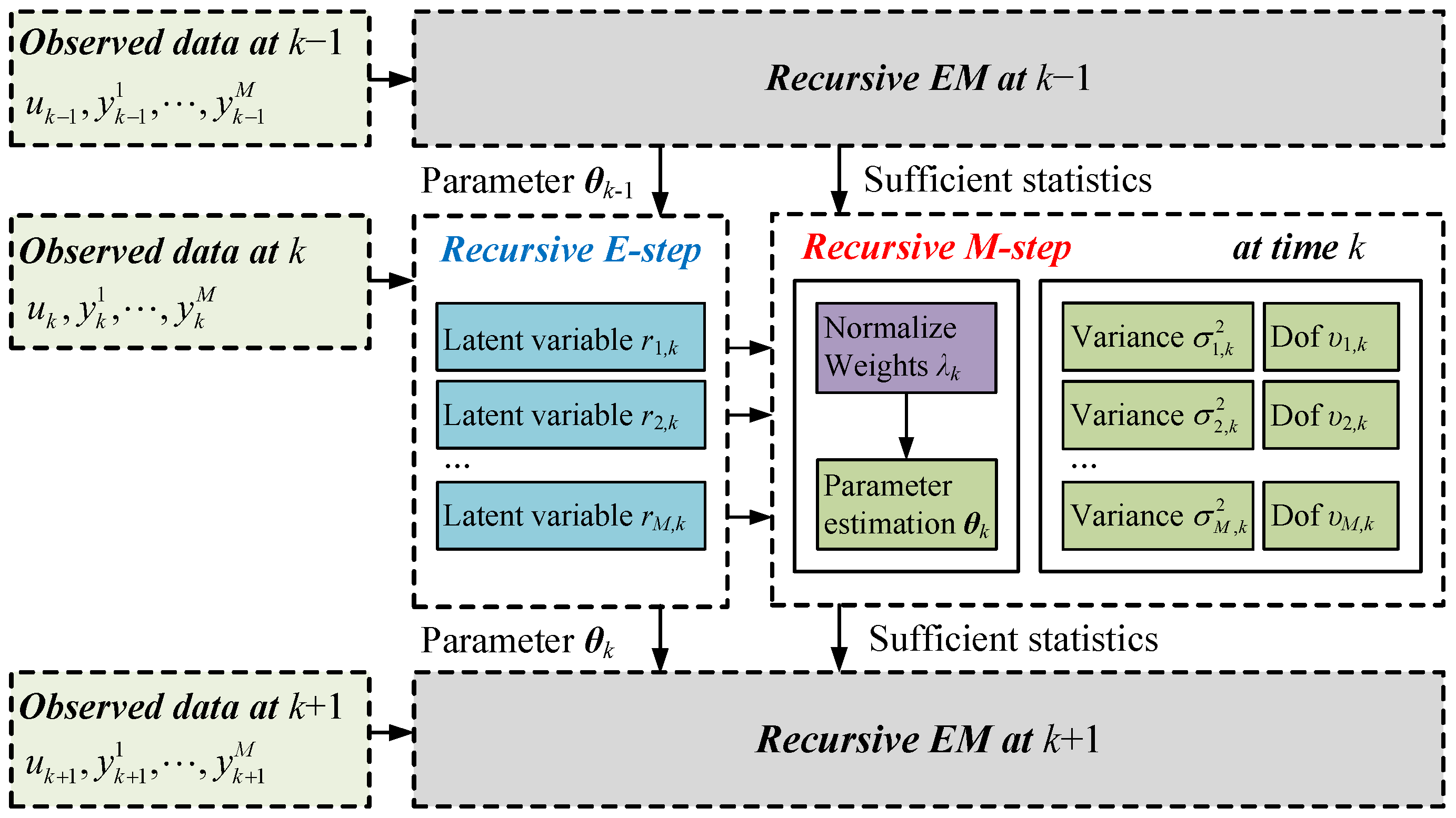 Second, a recursive Q-function is derived, based on which a recursive framework of the EM algorithm is accomplished together with sufficient statistics recursion. The real-time requirement of dynamic system identification is satisfied;