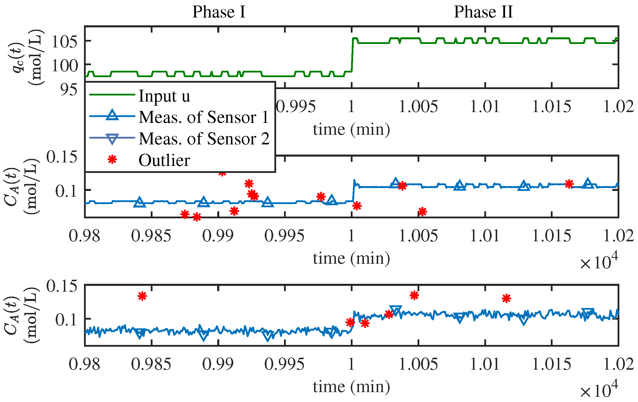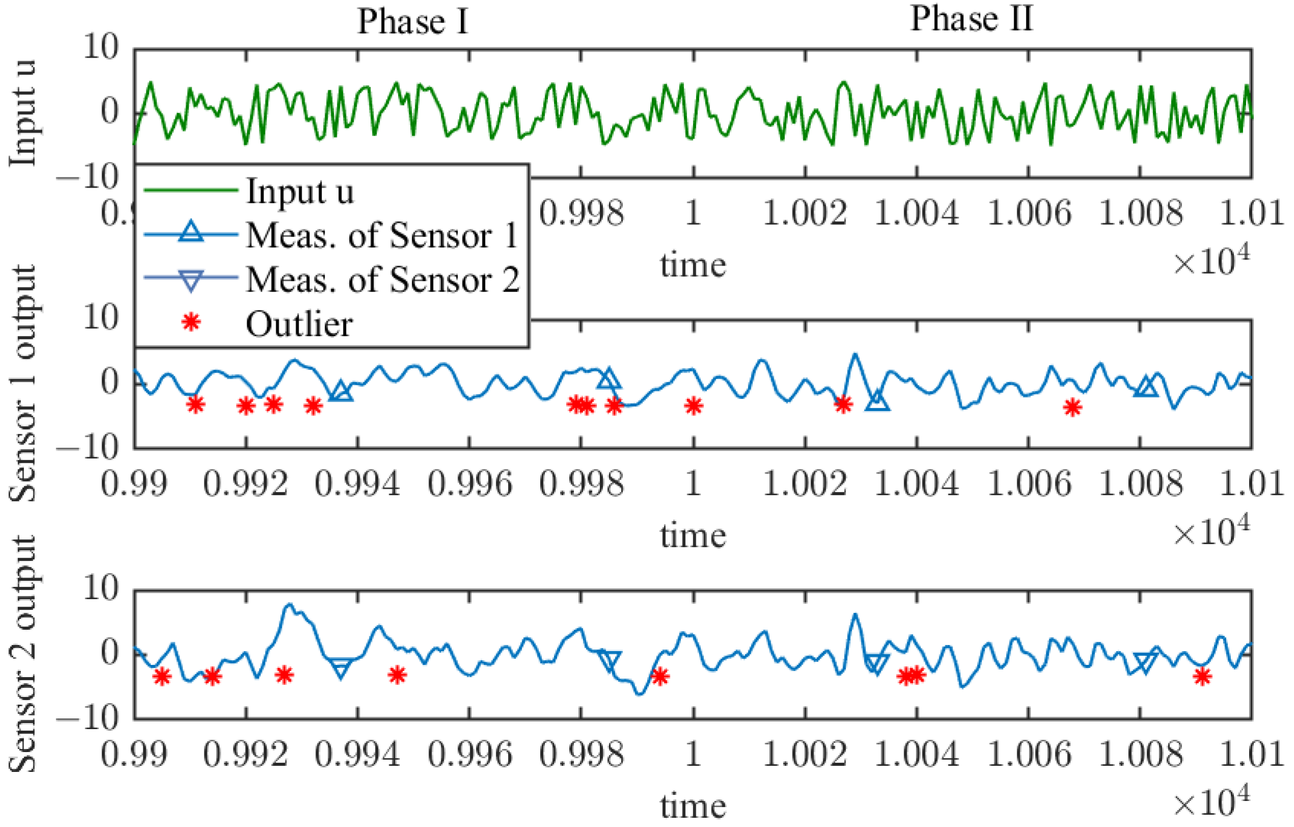Figure 6 exhibits a curve segment of the input and the two sets of output neighboring the stage switching instant. The outliers that were generated on purpose are also marked in the figure.