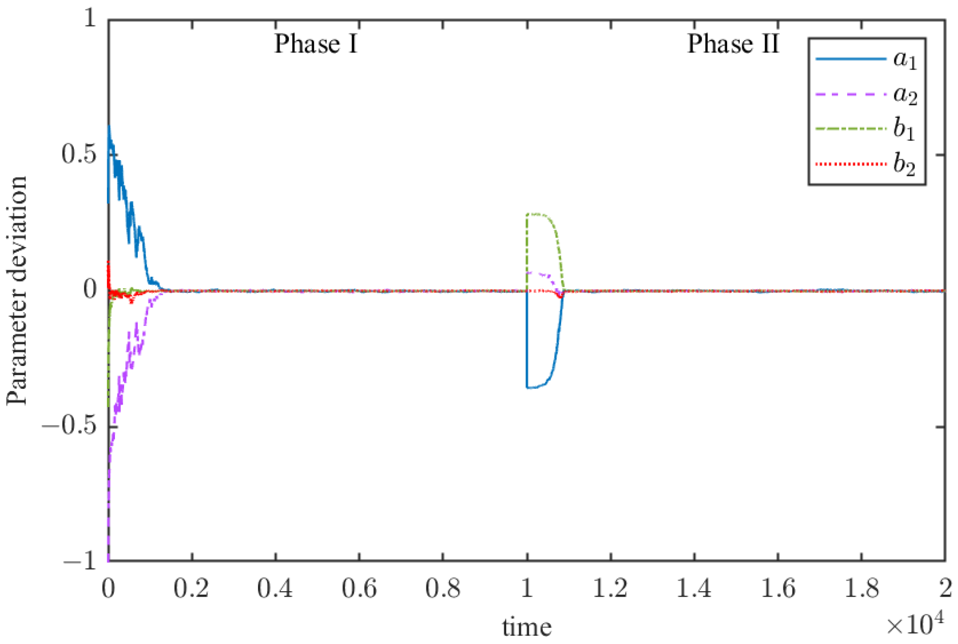 Figure 3. The figure shows that convergence occurs after 2000 samples in the first stage. When the system switches the parameter vector to stage 2 at the 10,000-th sample, the proposed recursive algorithm converges again after 1500 samples.