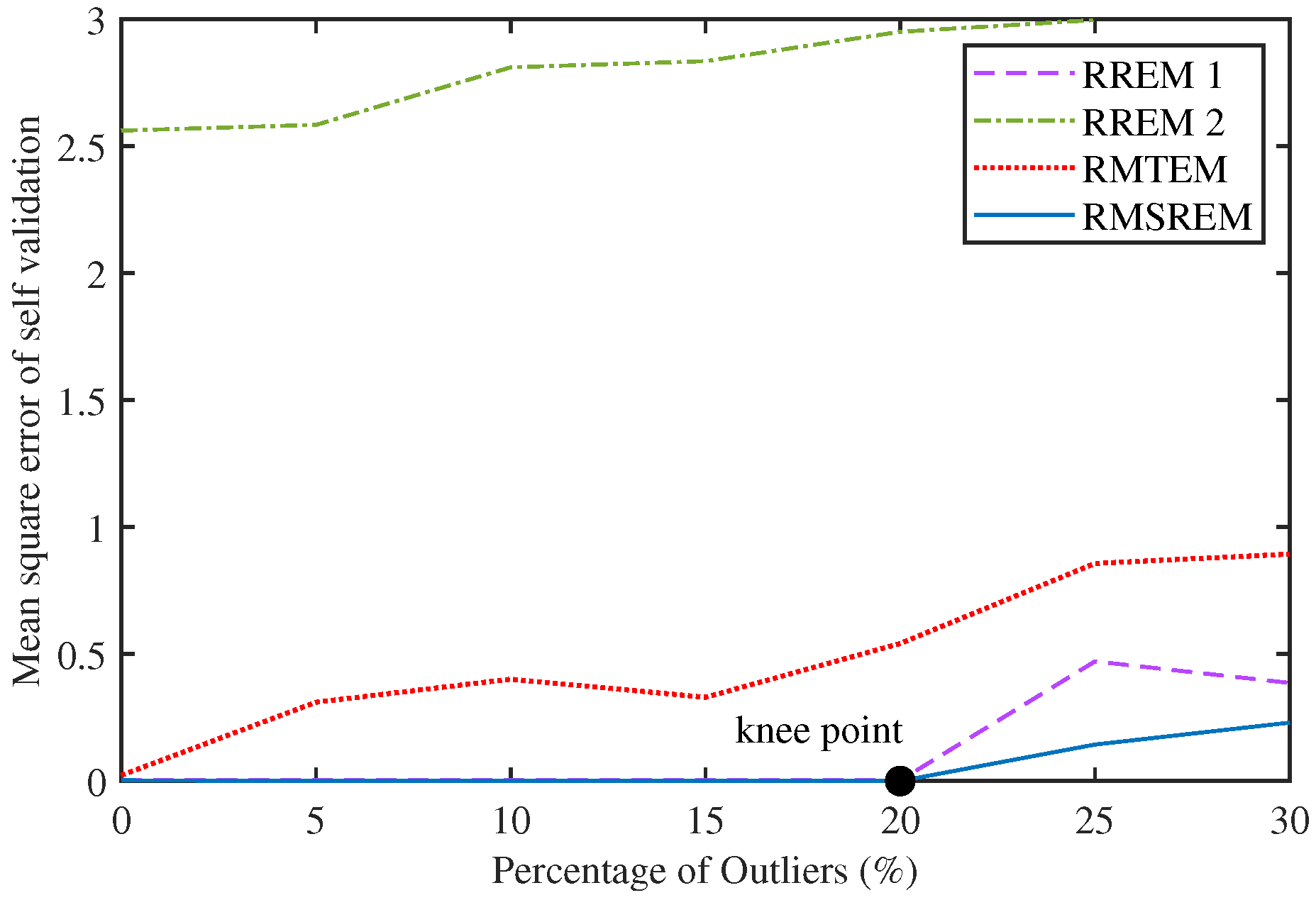 Figure 4 plots the variation curve of MSE for self-validated N-step prediction, where the knee points of the proposed algorithm are marked. The curve in the left region of the inflection point is the effective range of the algorithm in this numerical simulation. The results indicate that the inflection point of the RMSREM algorithm falls within the range of 20% to 25%.