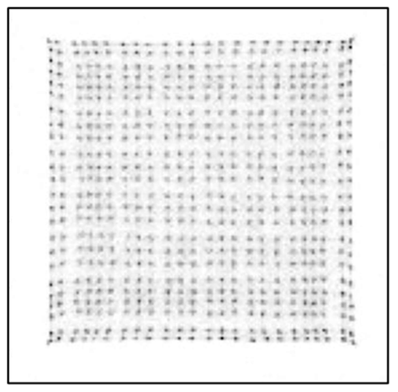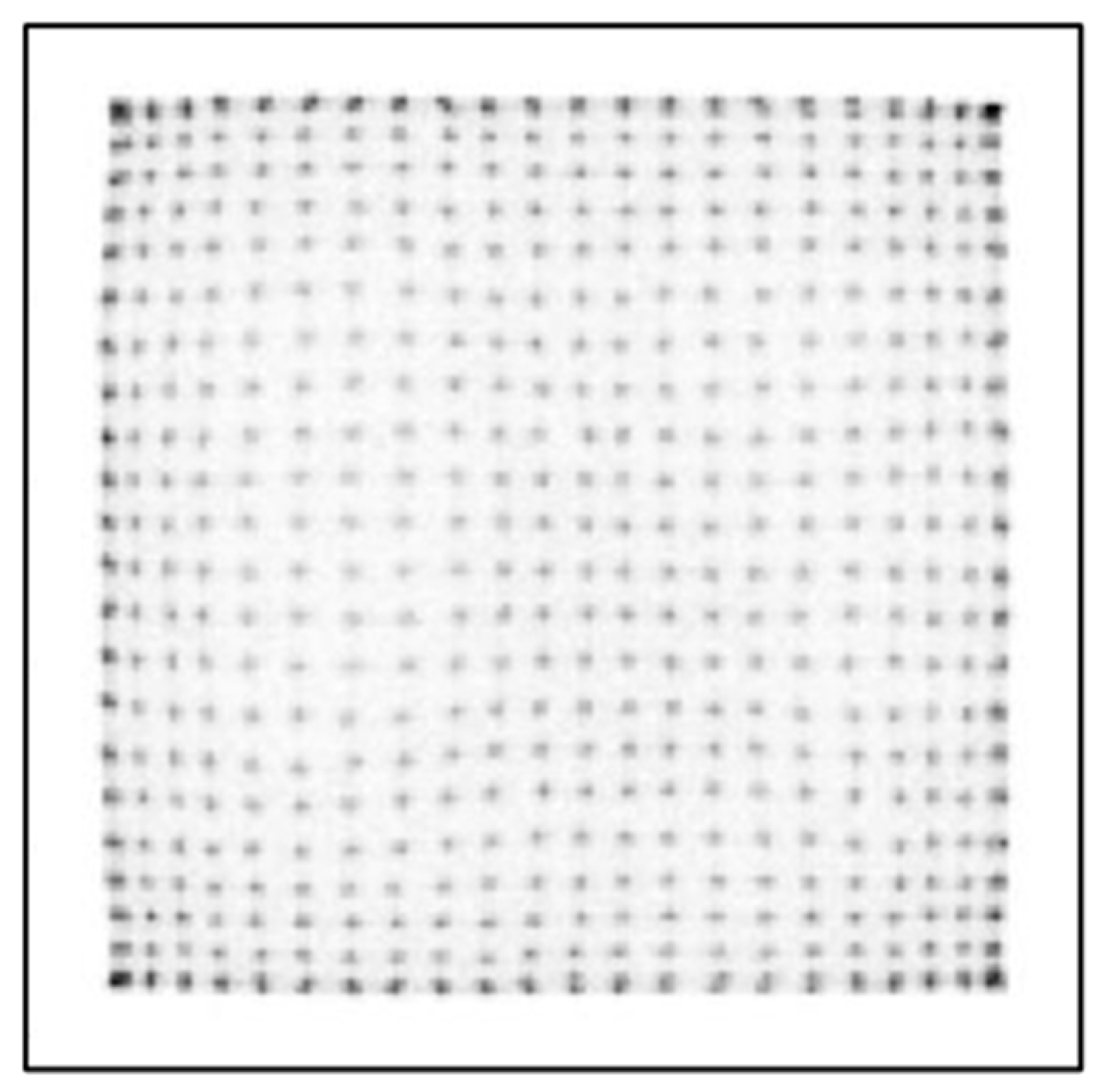 The results shown in this paper focus on three main acquisition parameters: the design of the light guide used in PET sensor modules, the algorithm used in coordinate reconstruction and the signal readout method. Figure 6, Figure 7, Figure 8, Figure 9 and Figure 10 show a selection of the highest quality crystal maps generated by experimenting with different sets of parameters. The crystal map in Figure 6 is the “base case”, with a solid light guide, traditional CoG and multiplexed readout. The crystal map is significantly compressed in size compared to actual detection area, only shows 22 pixels in any given column or row and best illustrates the “edge effect” in modular PET system design due to asymmetric light distribution. TCoG algorithm (Figure 10), even with an individual channel readout, when applied to a solid light guide, provides only limited improvement in crystal map quality: pixels are more uniformly distributed and crystal map appears less compressed; however, edge pixels are not resolved.
