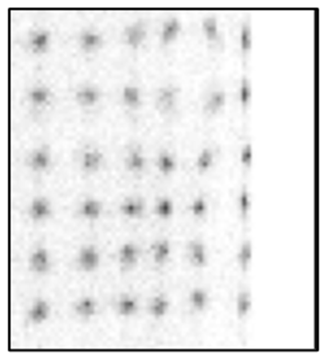 Figure 11, Figure 12 and Figure 13 show zoomed images of the center of the rightmost edge of the crystal map comparing various PSLGs with different slit depths (2.5 mm, 3.0 mm and 4.0 mm, respectively) created with single channel readout and TCoG. Figure 13 reinforces that the best crystal map quality in terms of resolvability of edge pixels and representation of a true size of a crystal array is achieved with a combination of a segmented light guide with slit depth of 4.0 mm, single channel readout and TCoG.