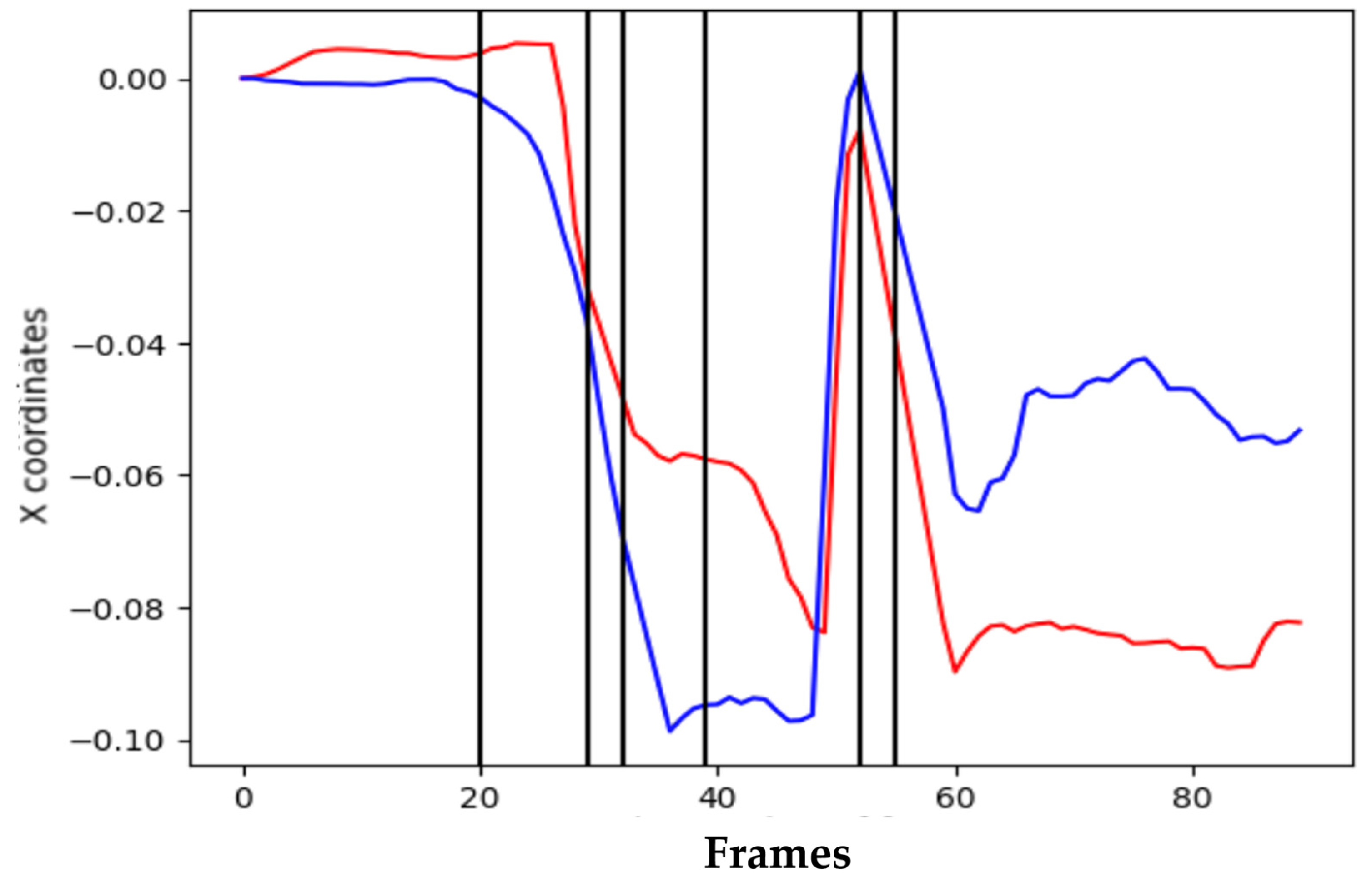 DMSM first segments each video into the seven phases described in Section 3.2. Within each phase, we compute a dynamic similarity measure based on the path differences between corresponding joint trajectories. Let x(t) and y(t) denote the 1D trajectory (e.g., a joint’s x- or y-coordinate) from two videos within a phase, and let t ∈ [t0, t1]. We define the phase-wise dissimilarity as the integral of the absolute difference between trajectories: