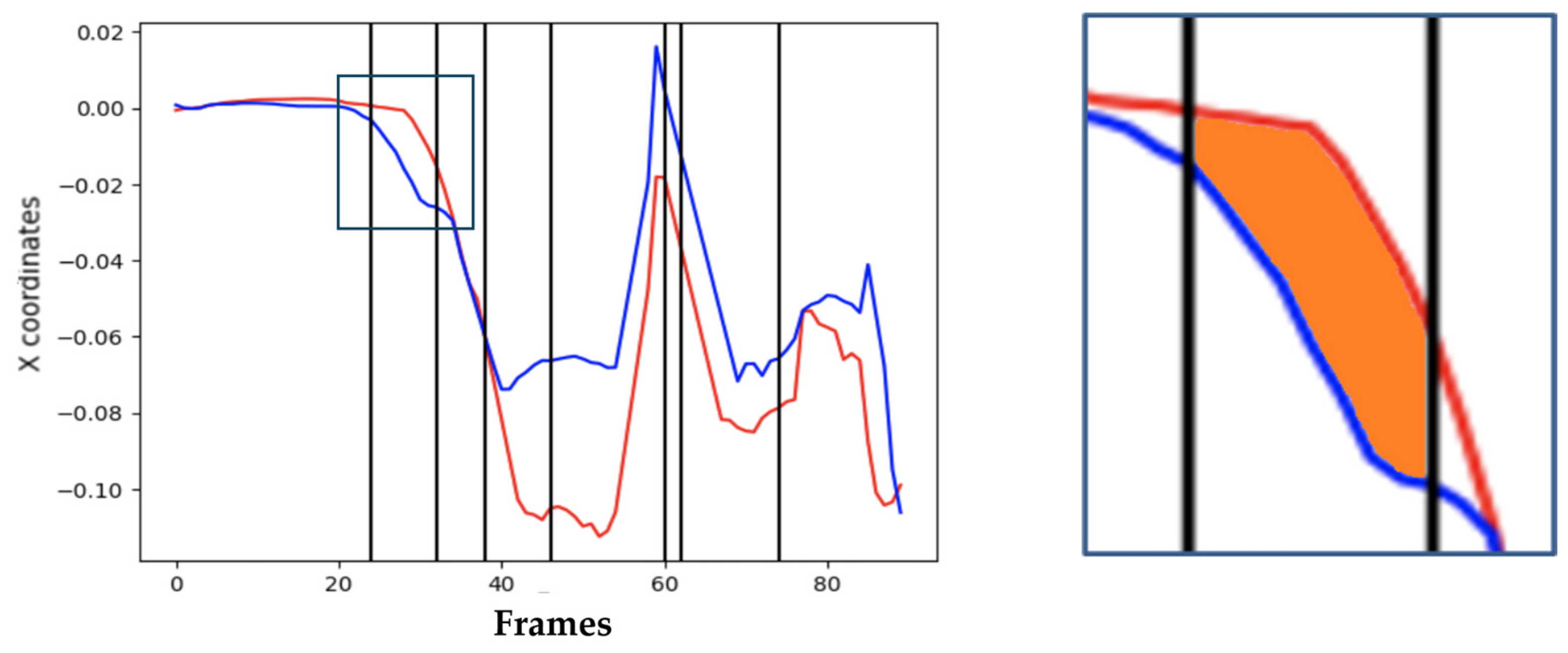 Because D(S) aggregates discrepancies across the entire phase, it captures differences in movement paths and timing that frame-wise cosine similarity can miss. Figure 5 plots example wrist x-coordinates from two players; Figure 6 visualizes the area that DMSM integrates. In addition to absolute trajectory differences, we optionally compute joint-wise weighted contributions emphasizing hips, spine, and hands, reflecting biomechanical relevance in golf swings. The computational complexity of DMSM scales linearly with trajectory length (O(N)), supporting real-time execution on CPUs and resource-limited edge devices. Unlike PSIM, which evaluates posture similarity primarily from frame-level pose embeddings, DMSM explicitly integrates phase-wise temporal motion flow, enabling more robust discrimination of swing rhythm and biomechanical continuity.