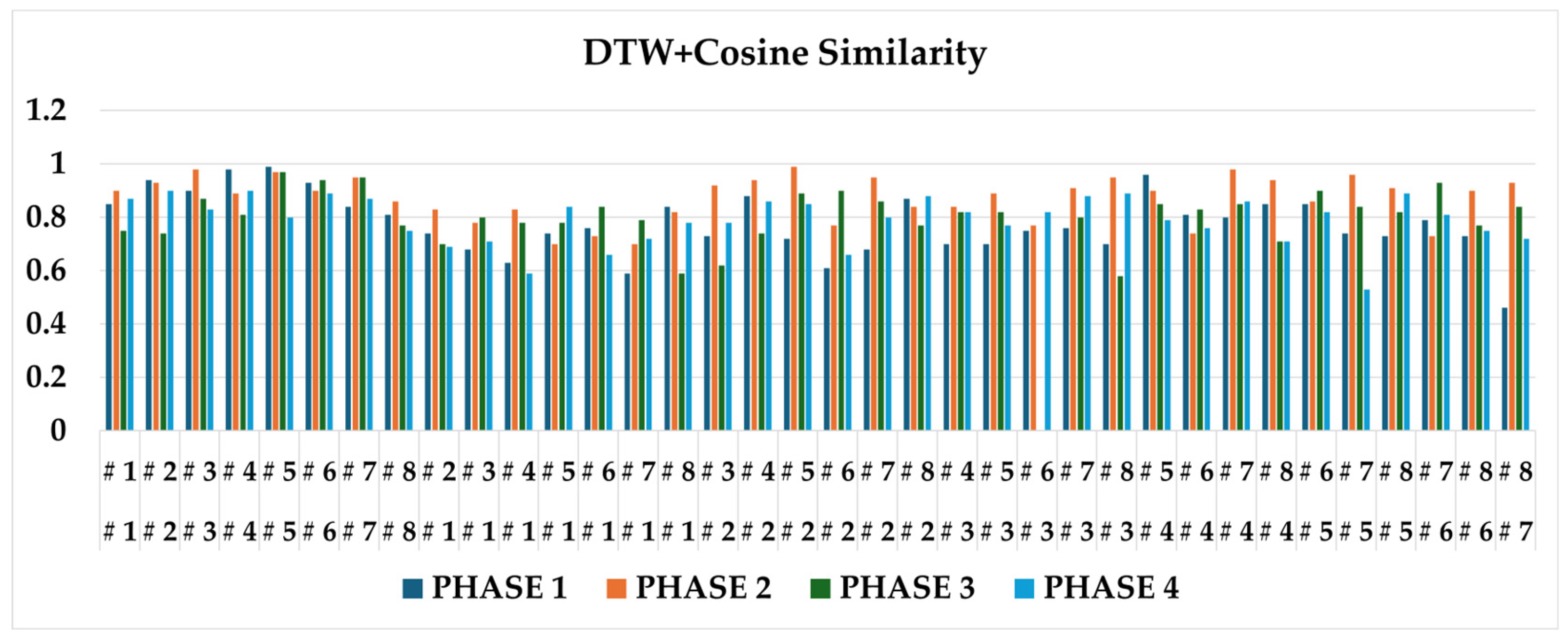 Figure 9 illustrates the overall DMSM results. The intra-player comparisons (left clusters) exhibit consistently lower dissimilarity values, while inter-player comparisons (right clusters) show clear separation. This confirms that DMSM provides more stable and discriminative similarity evaluation than the baseline. By focusing on path integration rather than instantaneous vector comparison, the metric effectively highlights player-specific swing consistency and rhythm.