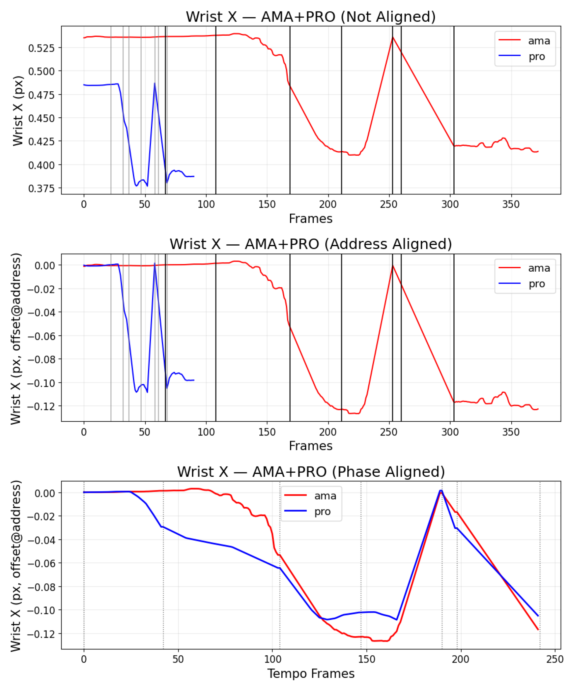 Nevertheless, when existing motion-comparison techniques are applied to golf swings, their outcomes often fail to match human perception. Typical similarity evaluations compare joint vectors at a handful of discrete stages, requiring tight synchronization between two videos and focusing on static postures rather than dynamic movement across the entire swing. In practice, two swings can differ in the onset, intermediate, and terminal timing of each phase. As a result, purely frame-wise comparisons—even when assisted by DTW—are inadequate for capturing the dynamic patterns that golfers and coaches consider salient. Prior DTW-based swing comparison approaches still rely on frame alignment and instantaneous joint vectors, limiting their ability to reflect continuous movement patterns and phase-specific biomechanics