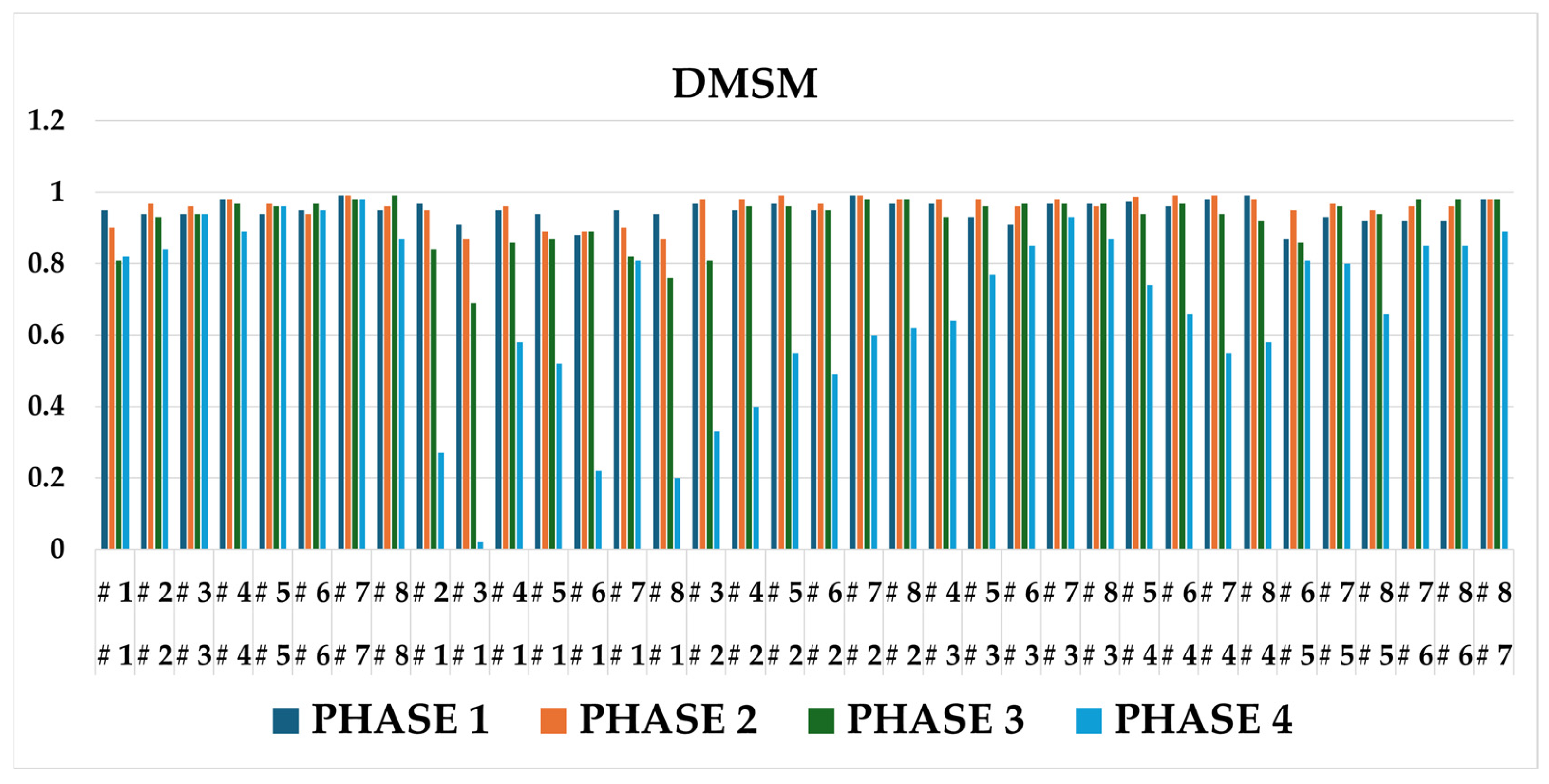 Table 3 summarizes the quantitative performance of the baseline methods and the proposed DMSM. DMSM achieved the highest mean similarity (0.882 ± 0.029), outperforming DTW + Cosine and PSIM (p < 0.01). Although its runtime (357 ms) was slightly higher than lightweight distance-based methods, it remains feasible for real-time edge deployment (<2 s per clip) while providing superior accuracy and phase-wise consistency.