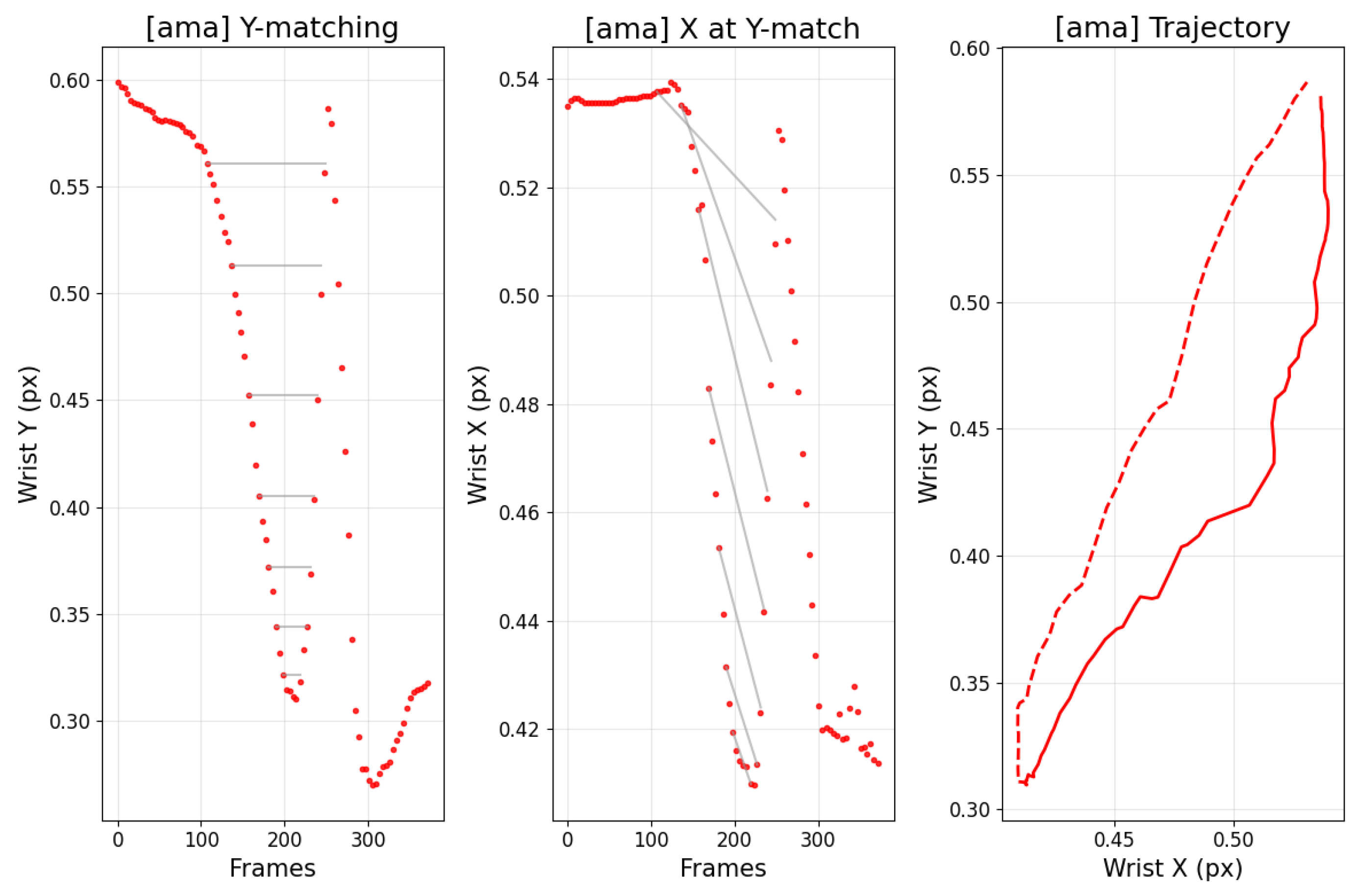 Dynamic Time Warping (DTW) [33] has been widely adopted to compare motion sequences with temporal misalignment. Im and Kim [34] applied DTW to pose-estimation keypoints for swing comparison, achieving alignment between unevenly paced motions. However, DTW-based frame matching still treats motion similarity as a sequence of instantaneous positions rather than as continuous spatial trajectories. This limitation leads to instability when local misalignments or jitter occur, reducing the interpretability of results. DMSM mitigates these issues by integrating motion paths within each phase, rather than matching individual frames, thereby enhancing temporal and biomechanical stability.