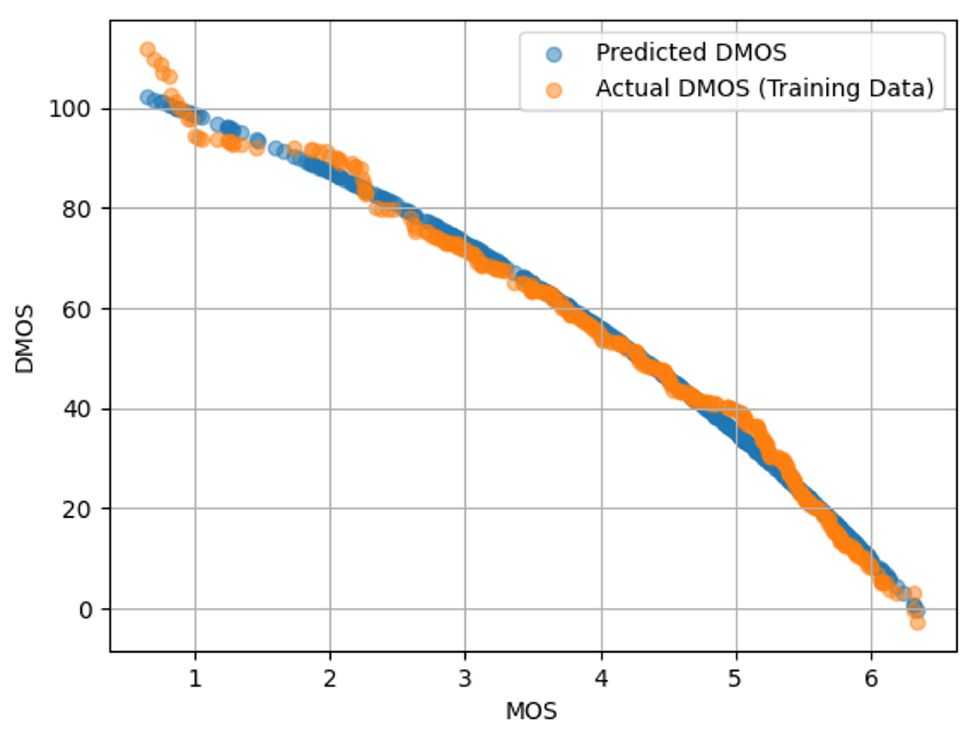 Figure 4 shows a scatter plot with MOS on the x-axis and DMOS on the y-axis. The orange points represent the actual DMOS values from the training data used to fit the logistic regression model, while the blue points indicate the DMOS values predicted by the model. Although there is some divergence for low-quality images, the logistic regression adequately captures the nonlinear mapping between MOS and DMOS, enabling accurate transformation from one scale to the other.