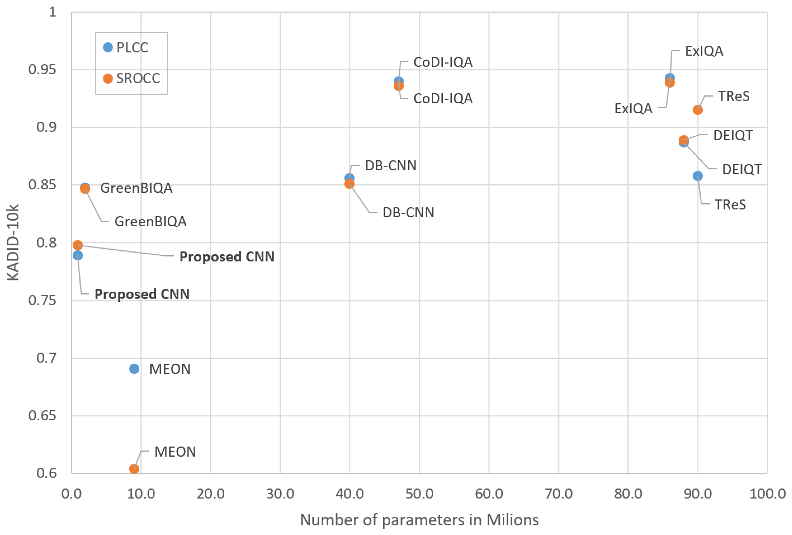 Figure 6 show the achieved PLCC and SROCC coefficients for all compared models as a function of the number their trainable parameters. The proposed architecture stands out by having the lowest number of trainable parameters while maintaining satisfactory correlation performance.