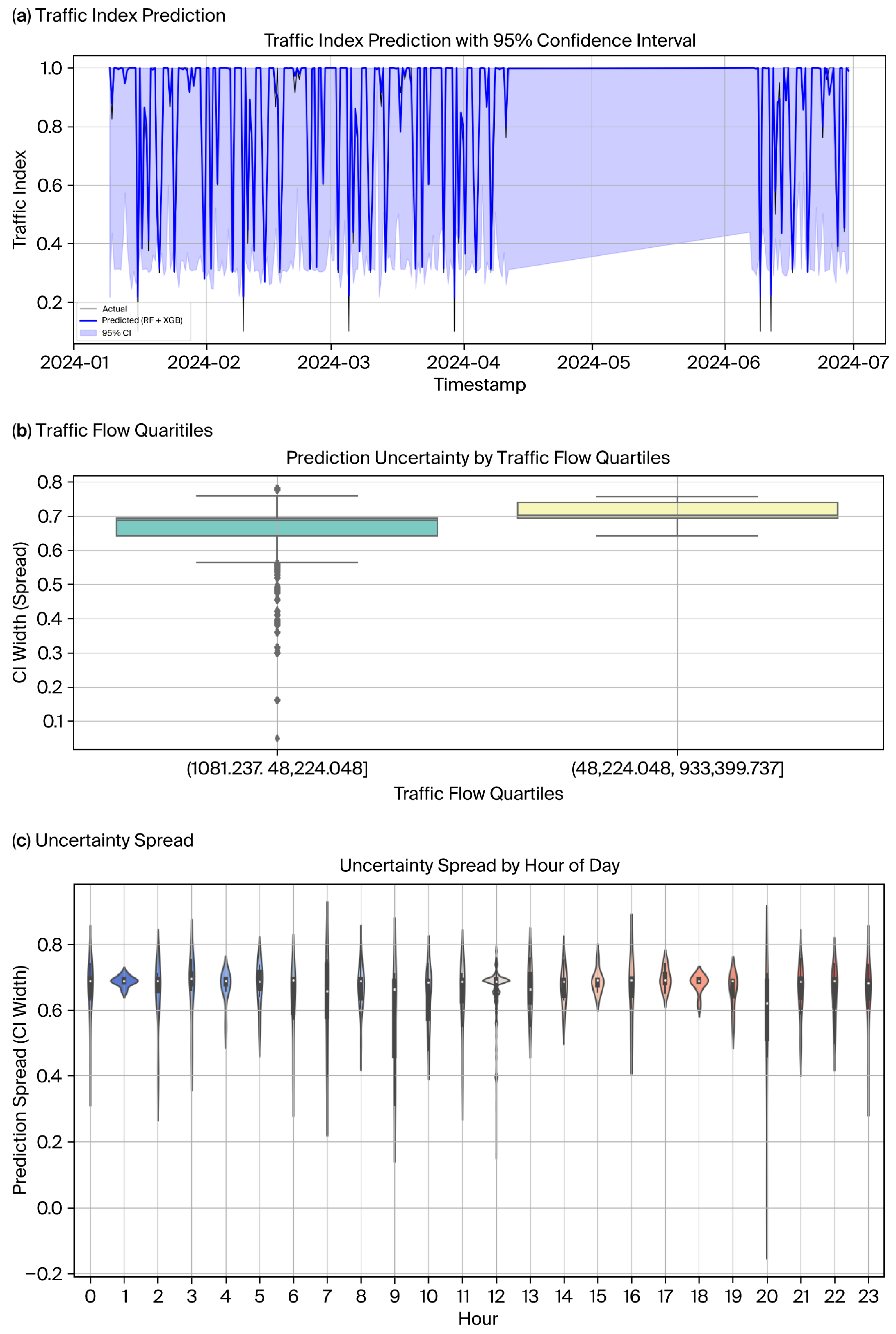 - Conformal prediction is applied for calibrated uncertainty intervals suitable for ITS deployment.