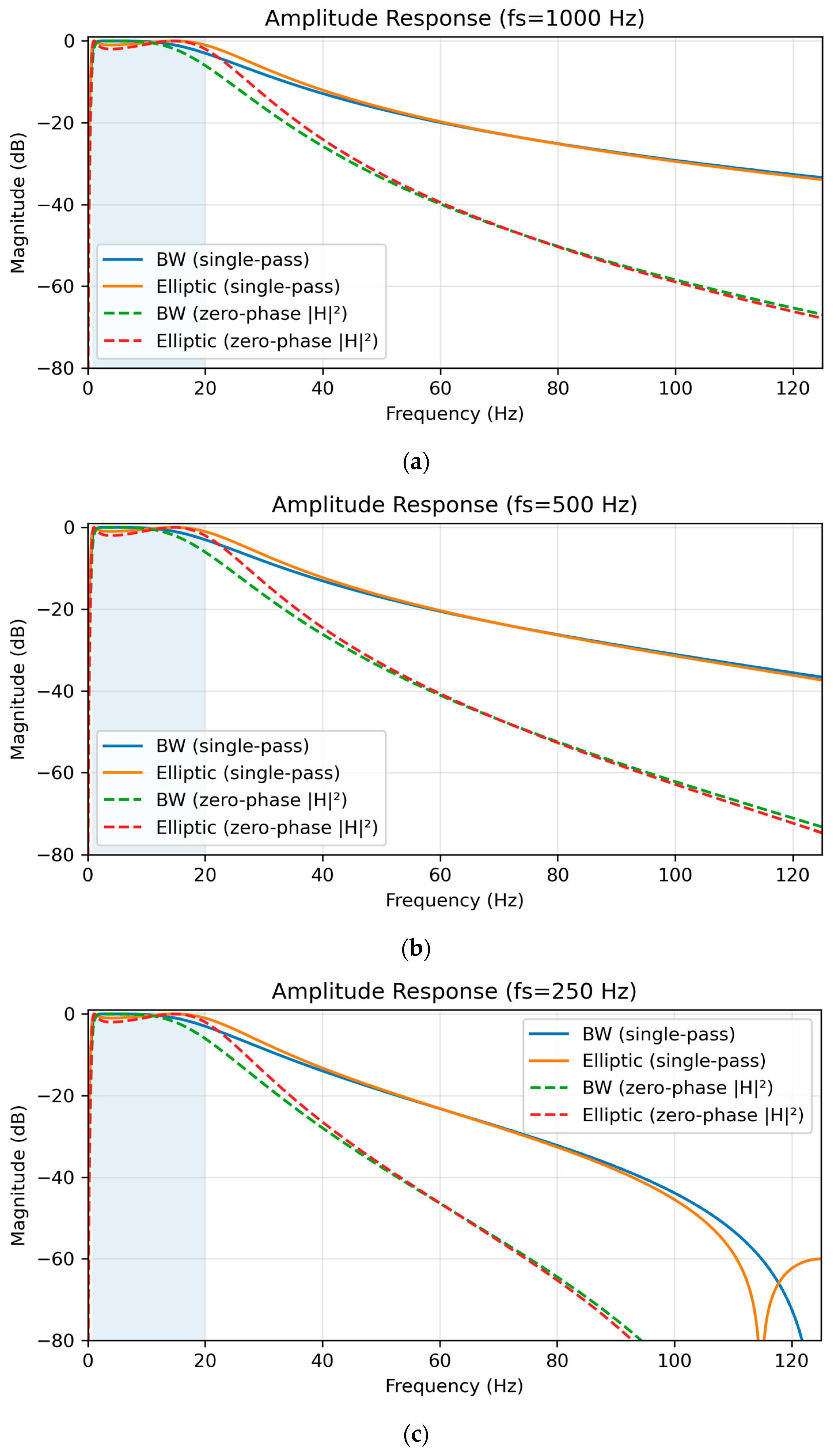 22]. Based on these considerations, both Butterworth and Elliptic designs were evaluated at sampling frequencies of 1000, 500, and 250 Hz, with coefficients computed in Python 3.10.9 using the scipy 1.10.0 package. The final coefficients are summarized in