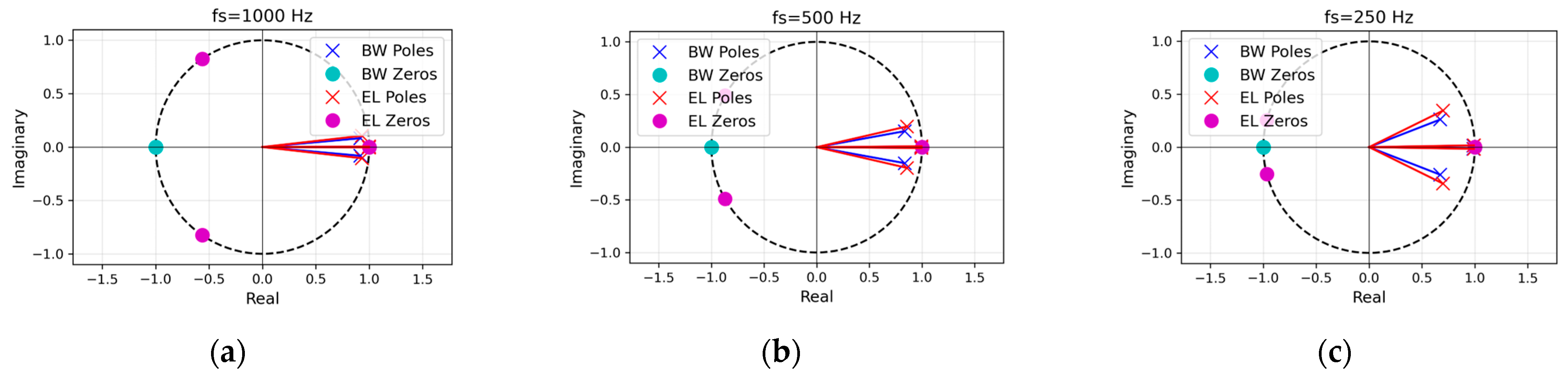 Figure 2) were generated to verify filter stability and interpret spectral behavior. All poles remained inside the unit circle (∣z∣ < 1), ensuring stability. Butterworth filters showed zeros at