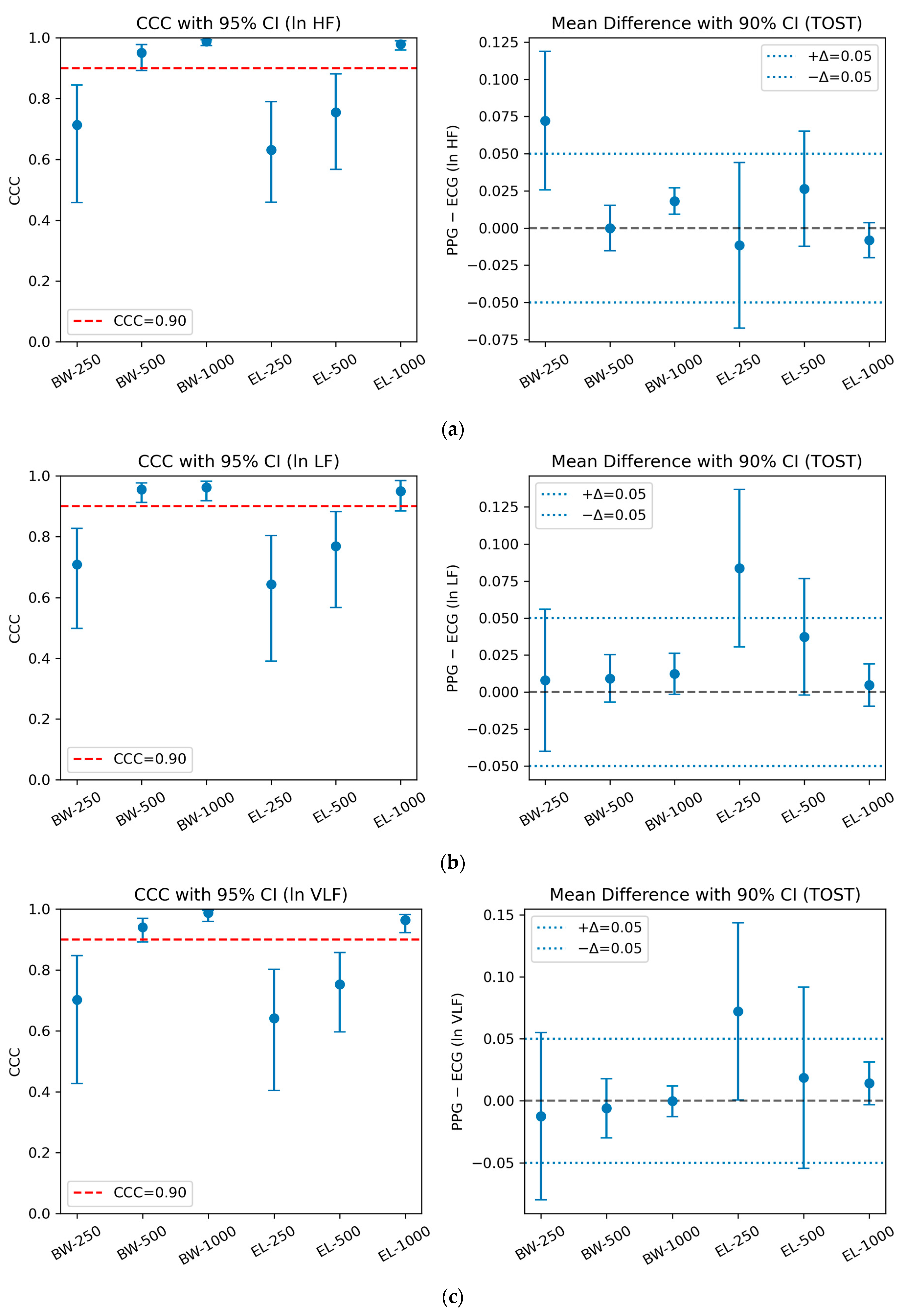 n = 23 participants would be ideal, our repeated-measures design (3 independent 2.5 min segments per participant) yielded 30 paired PPG-ECG measurements per filter-sampling configuration, increasing the effective sample size and precision of CCC estimates. This approach provides adequate statistical power for method comparison studies when the expected concordance is high (CCC ≥ 0.90).