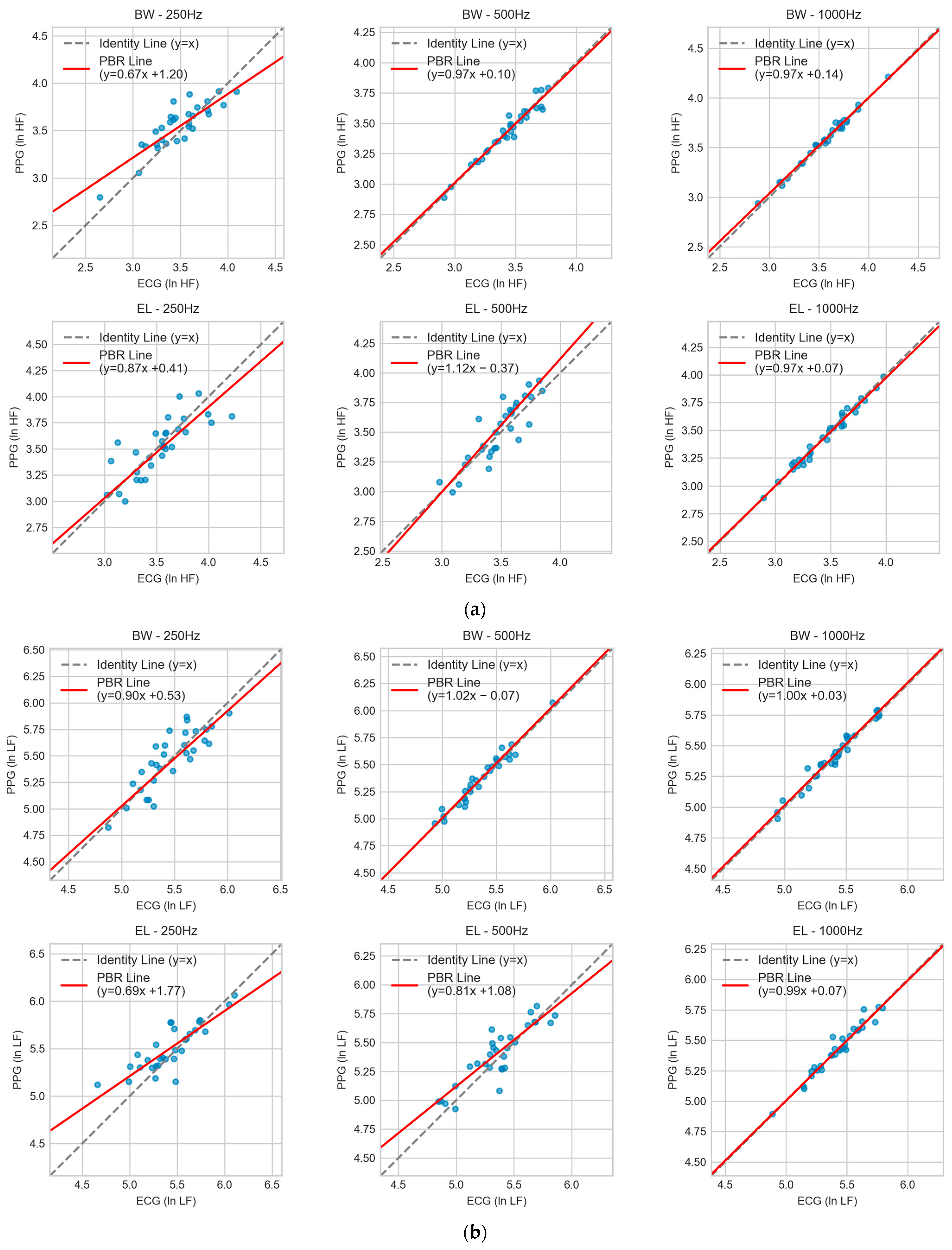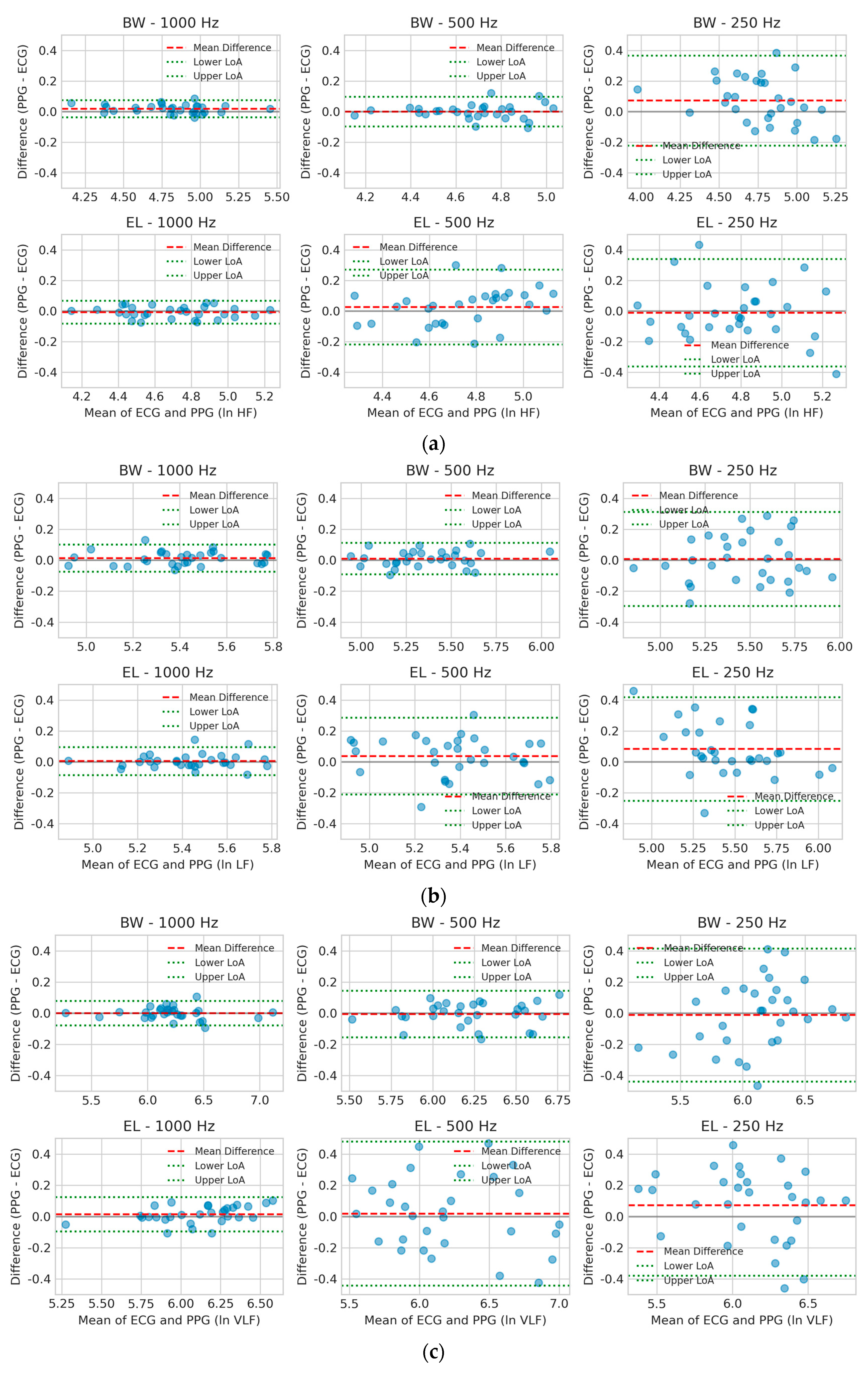14], which found Butterworth filters superior for NN interval extraction but lacked systematic frequency evaluation and direct ECG validation. The present study makes three key advances: (1) simultaneous PPG-ECG recordings for validation against the clinical gold standard, (2) a systematic comparison of sampling frequencies, and (3) comprehensive statistical validation using four complementary methods. Our recommendation of a ≥500 Hz sampling rate appears higher than the 20–50 Hz suggested by Béres et al. [