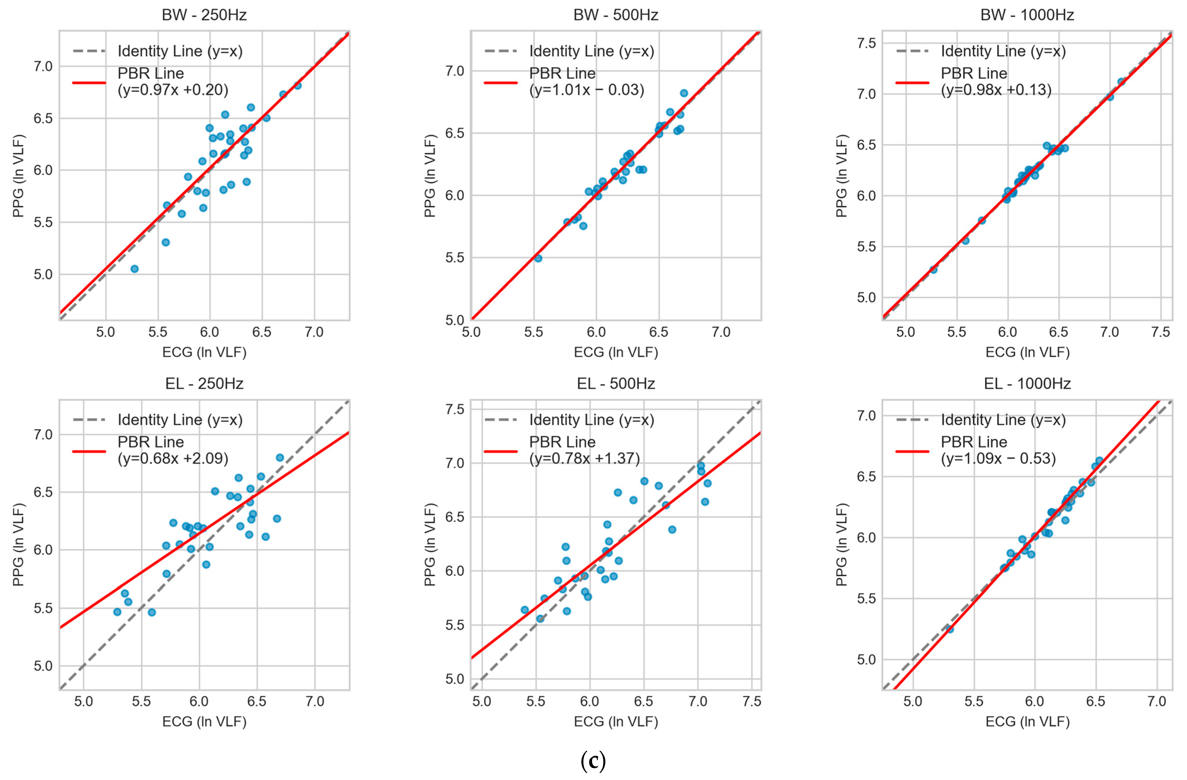 13], a difference attributable to our focus on frequency-domain parameters (ln HF, ln LF, ln VLF) without interpolation, where spectral fidelity is paramount. Filter-induced distortions at lower sampling rates and our stricter accuracy criteria (CCC ≥ 0.94, TOST equivalence) further justify the need for higher sampling rates to maintain clinical-grade accuracy in real-time, frequency-domain HRV analysis.