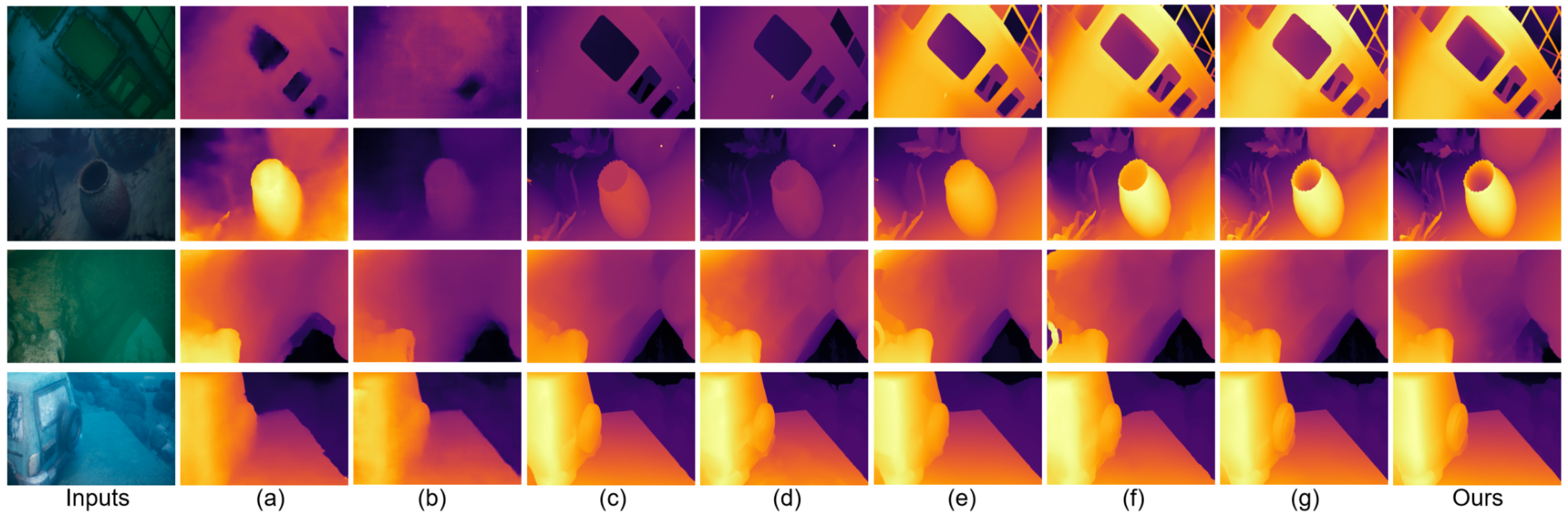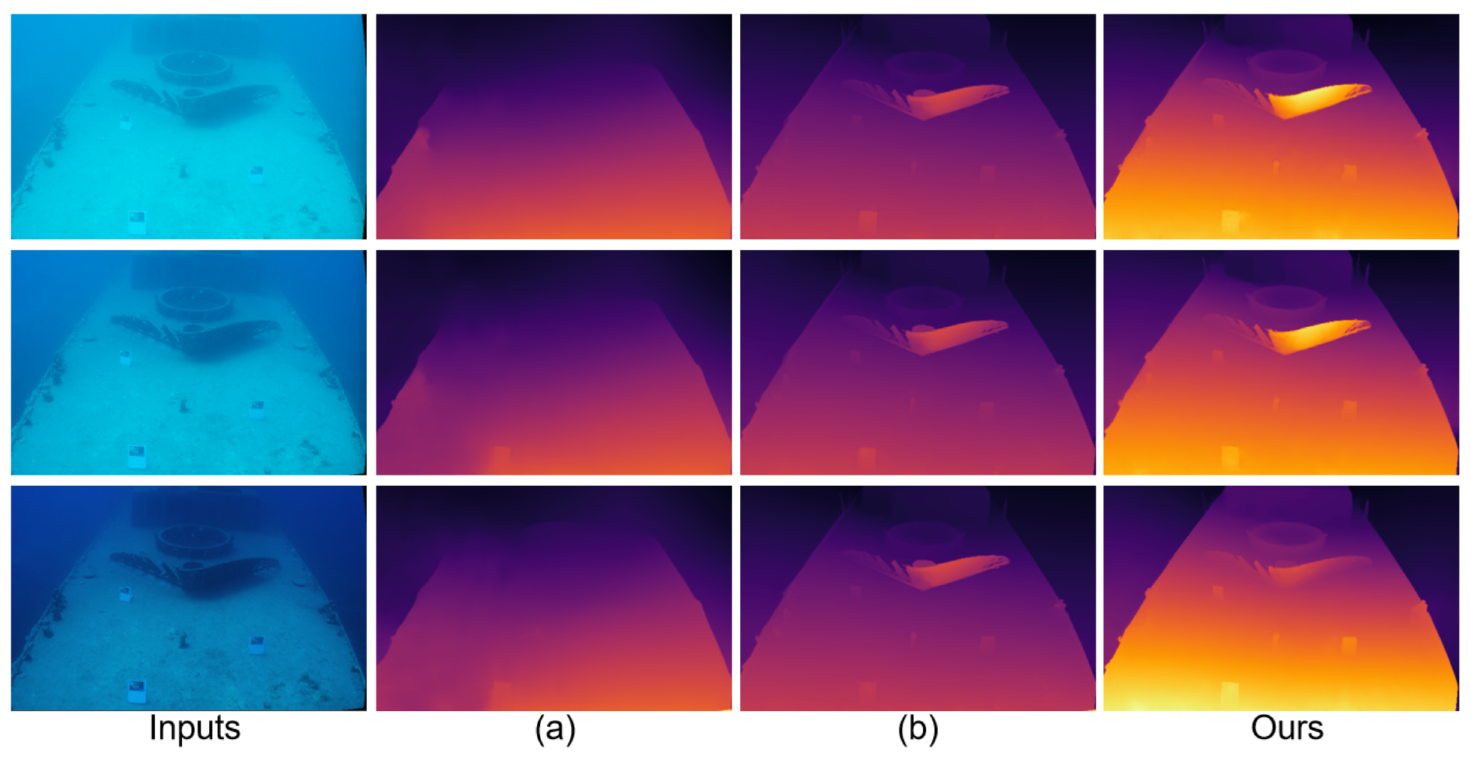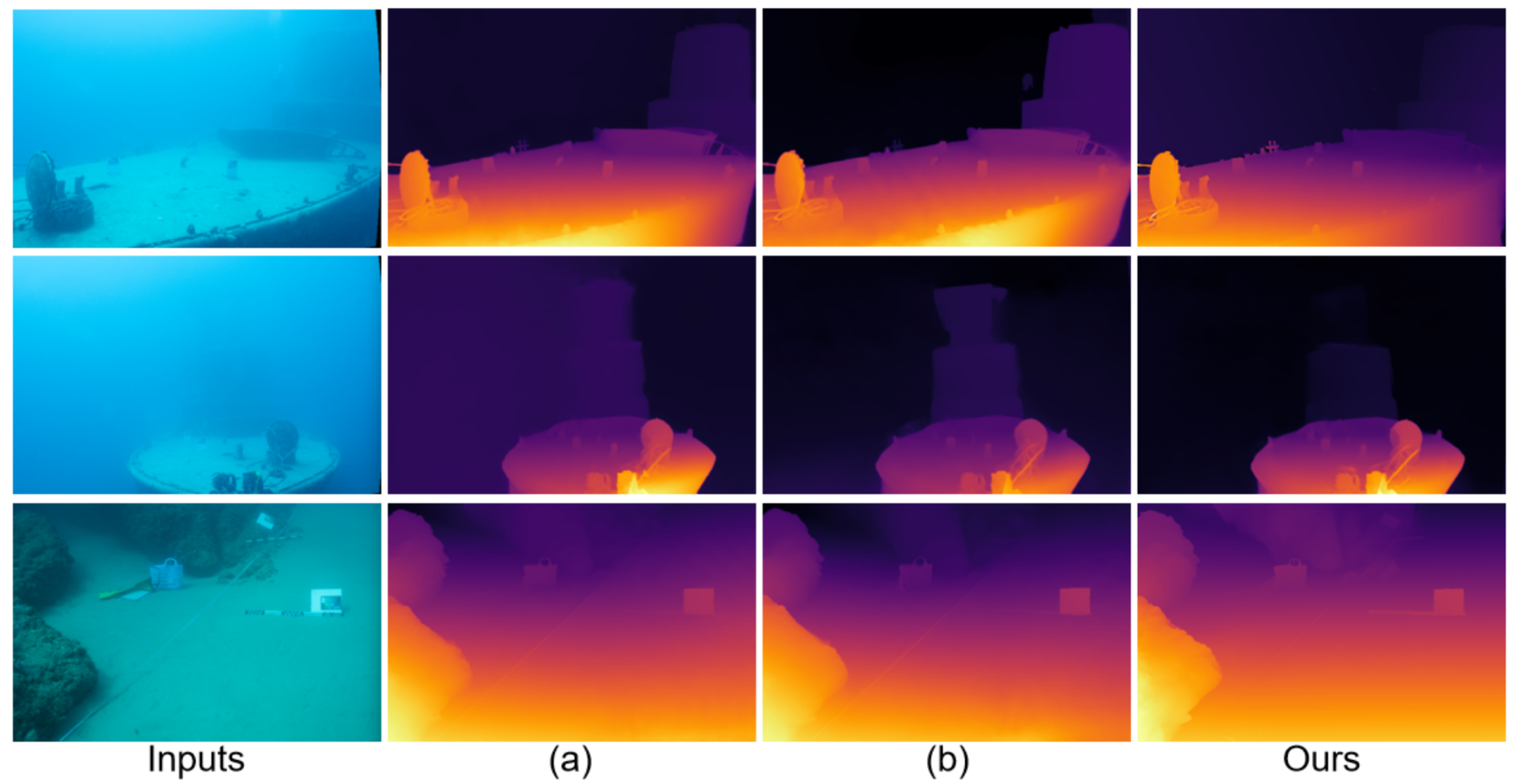In summary, synthetic underwater datasets lack real degradation priors, large-model transfer ignores underwater domain differences, and image enhancement fails to simultaneously balance dehazing, edge preservation, and detail retention. These issues result in significant errors in the final depth maps within occluded regions, low-texture regions, and distant regions.