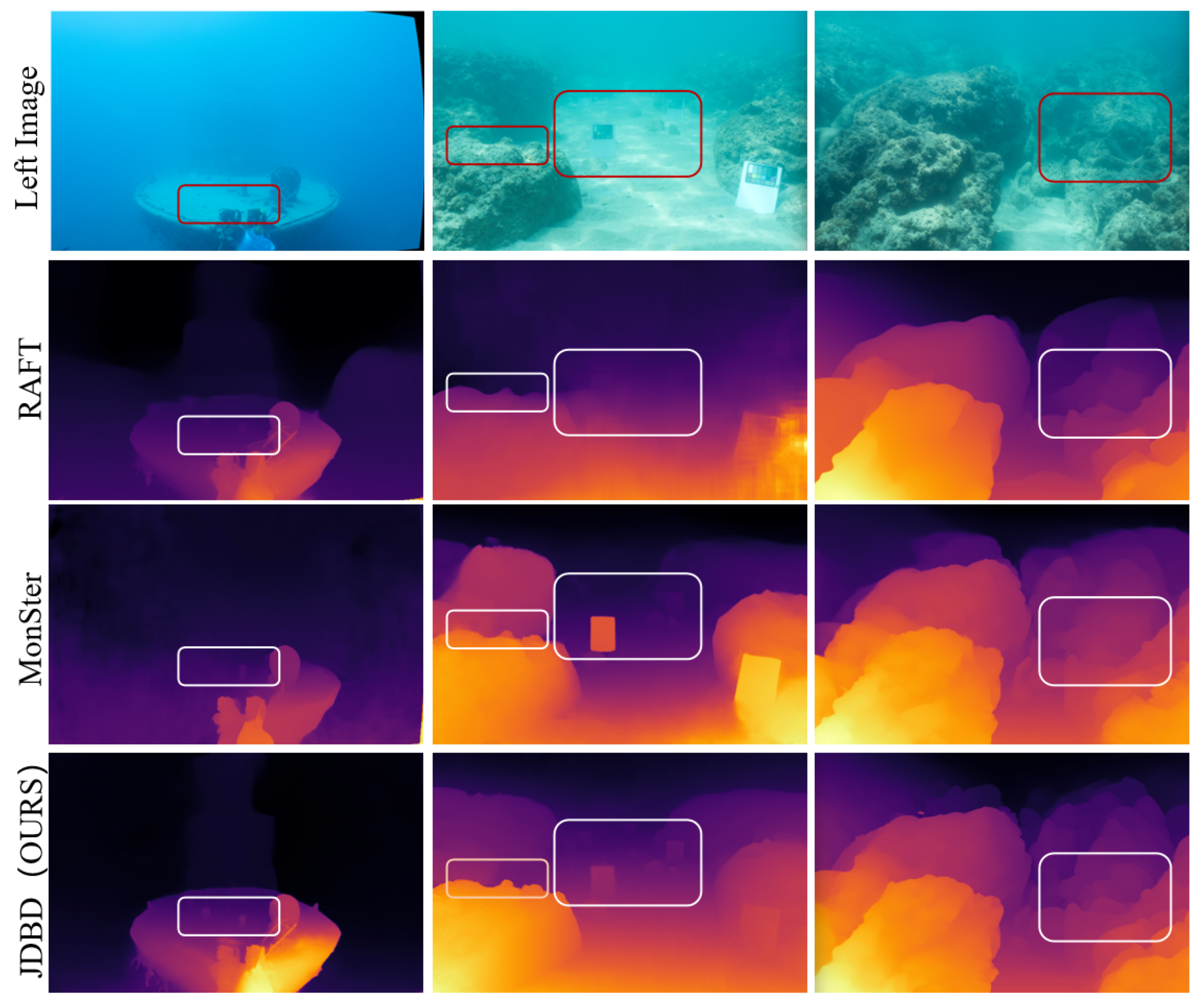 25] real-world dataset demonstrate that incorporating JDBD notably improves underwater depth estimation accuracy and visual quality, showing robust performance under diverse conditions. The main contributions of this paper are summarized as follows: