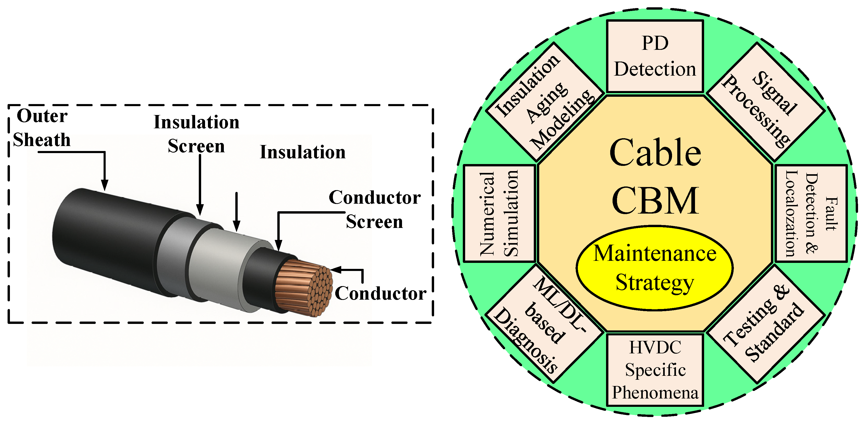 This review highlights that while significant advancements have been achieved in the sensing, modeling, and fault diagnosis of high-voltage XLPE-insulated cables, especially under AC and DC environments, practical deployment remains a complex challenge. From an operational perspective, integrating robust condition monitoring systems—including high-frequency PD sensors and synchronized acquisition tools—into live grids is essential for early failure prediction. Accurate lifetime estimation models must incorporate environmental and operational variability, especially in HVDC applications where space charge and polarity reversal significantly influence insulation behavior.