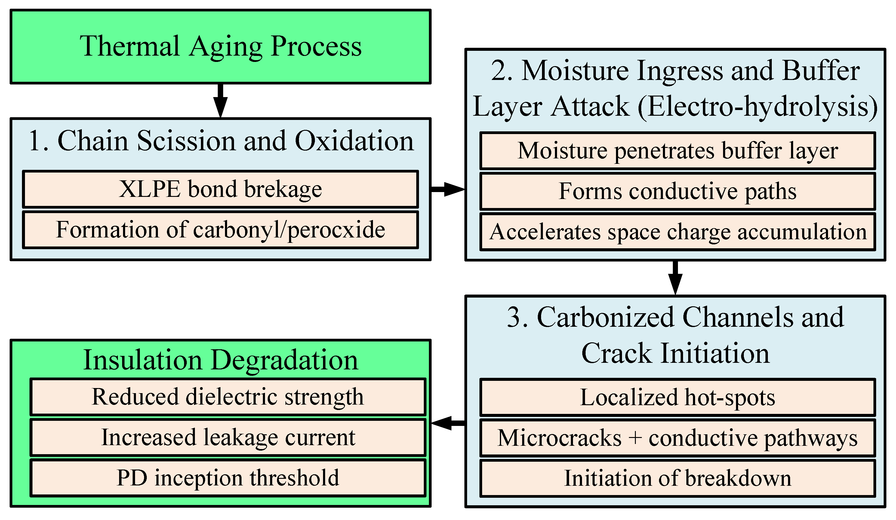 36]. The mechanisms of insulation aging and degradation under electrical, thermal, and environmental stressors are then discussed, especially in the context of XLPE-insulated systems, alongside various lifetime estimation models [