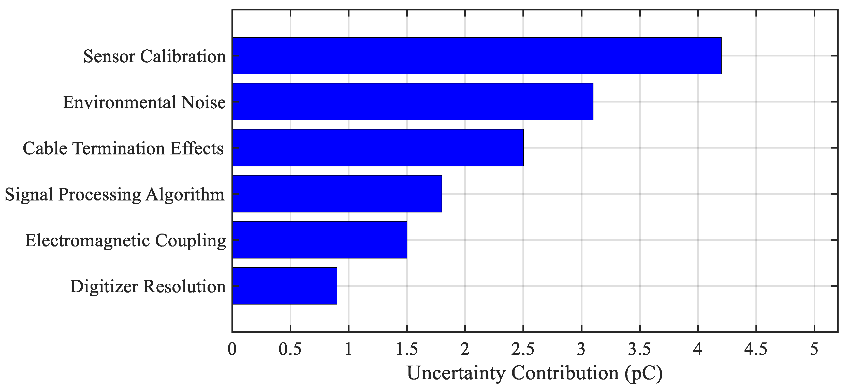 Example combined expanded uncertainty (k = 2): ±3.5 pC, mainly due to calibration (25%), EMI (20%), and reflection mismatch (22%). This procedure ensures traceable, comparable PD data between lab and field tests.