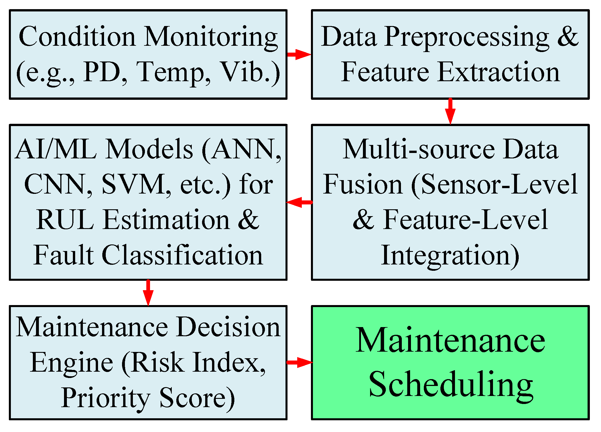 Figure 14 illustrates maintenance decision-making architecture using multi-source condition monitoring and AI inference. The framework integrates heterogeneous data sources (e.g., PD, temperature, vibration), applies preprocessing and fusion techniques, and utilizes machine learning models for Remaining Useful Life (RUL) estimation. Maintenance actions are triggered based on risk scores and condition severity, adapted from [