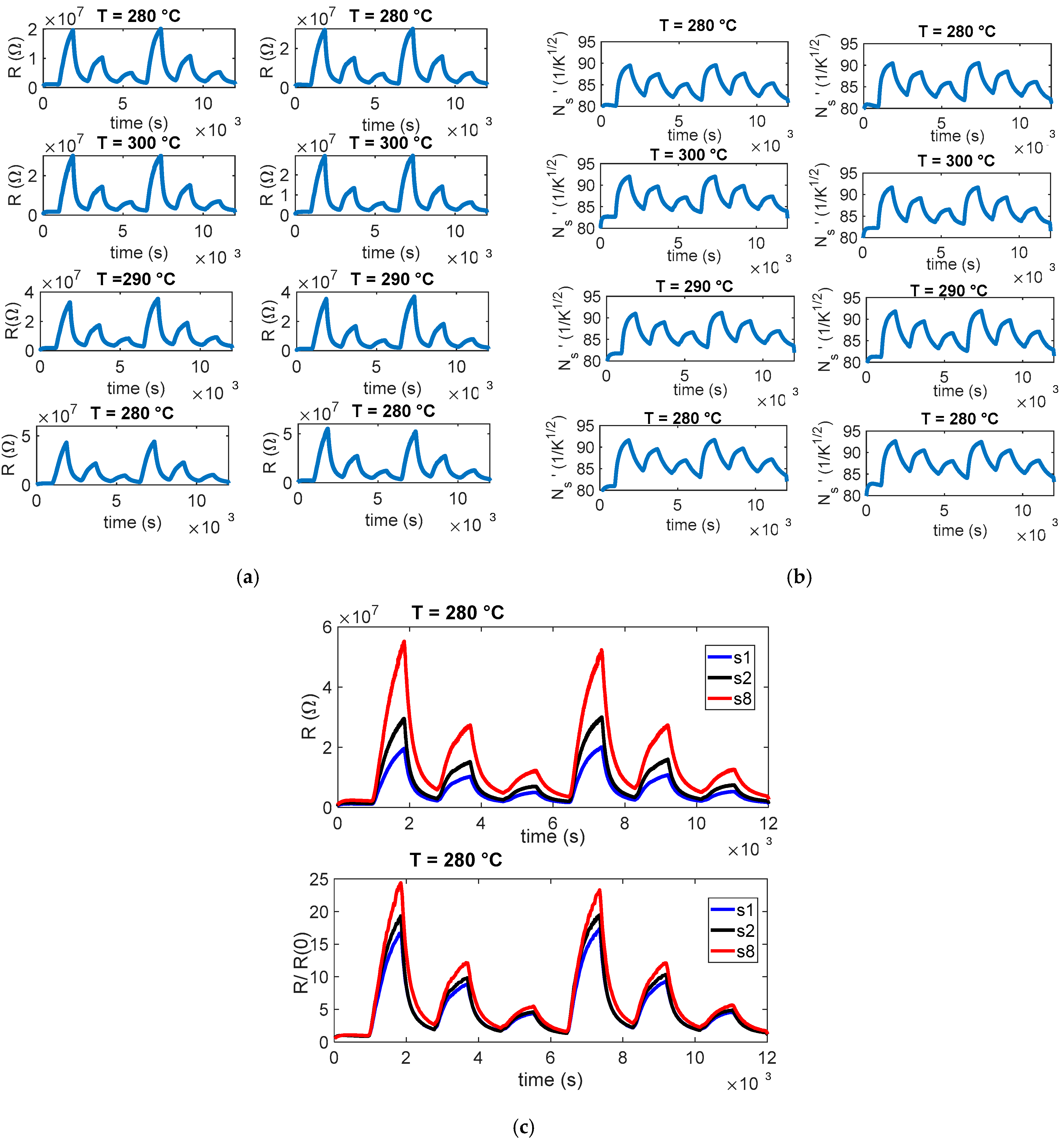 Figure 3. Specifically, panel (a) reports the measured resistance values R for the eight sensors; panel (b) shows an estimation of the normalized surface charge density, N