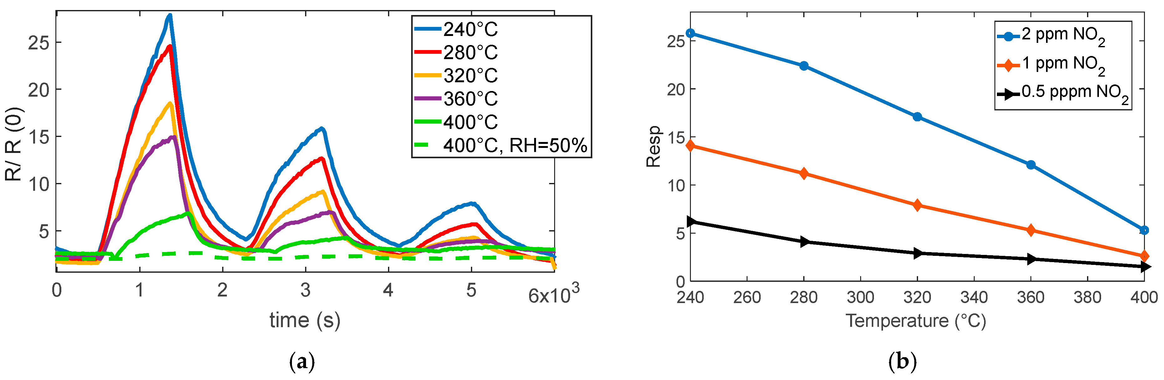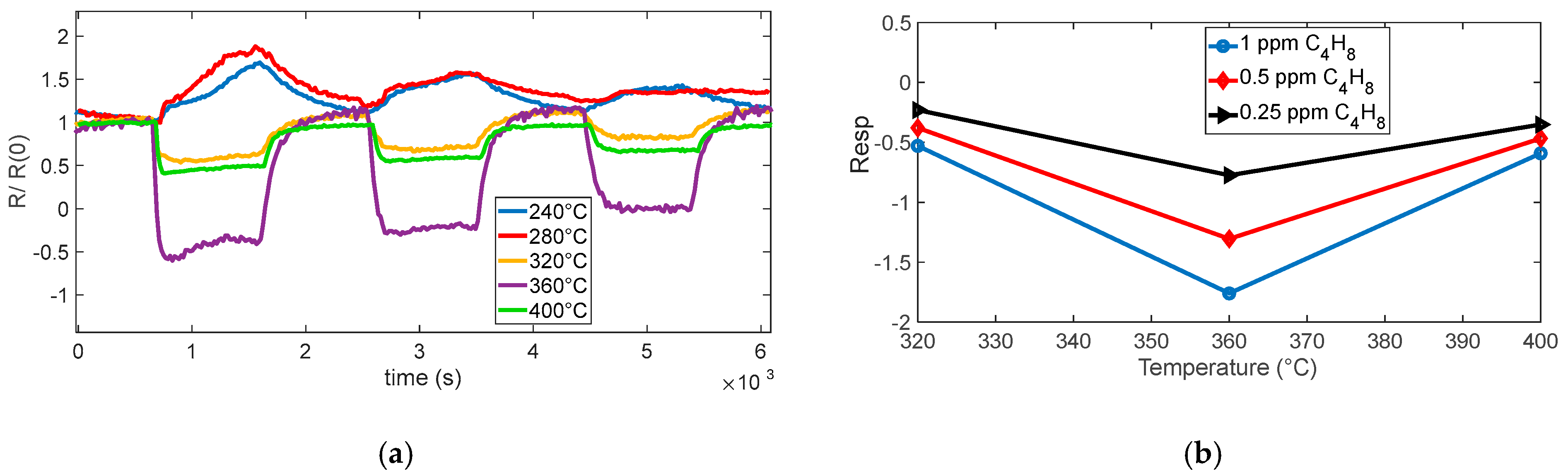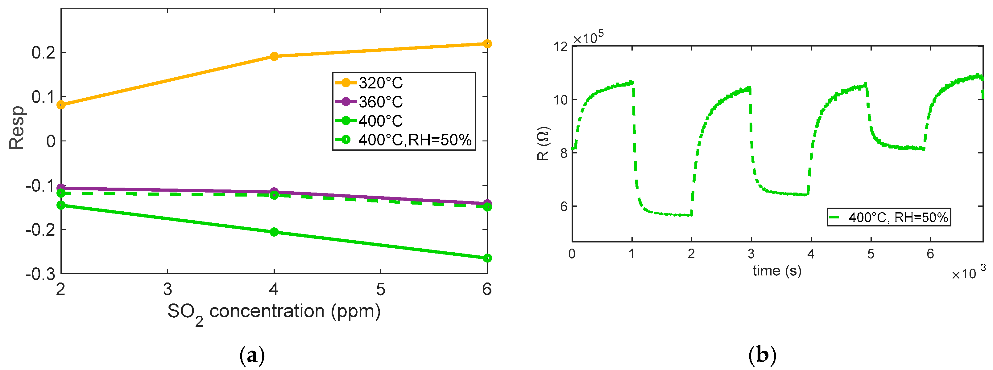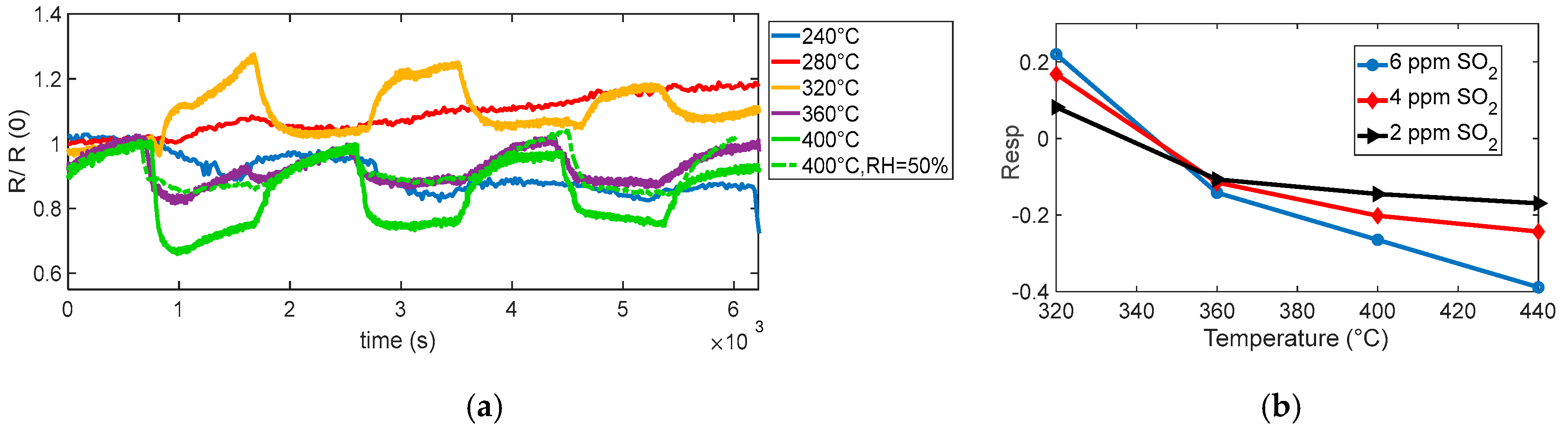 Figure 10. At lower temperatures (below ~320 °C), no considerable response is observed; interestingly, at 320 °C, the response even shows an apparent inversion: the sensor initially behaves as if SO